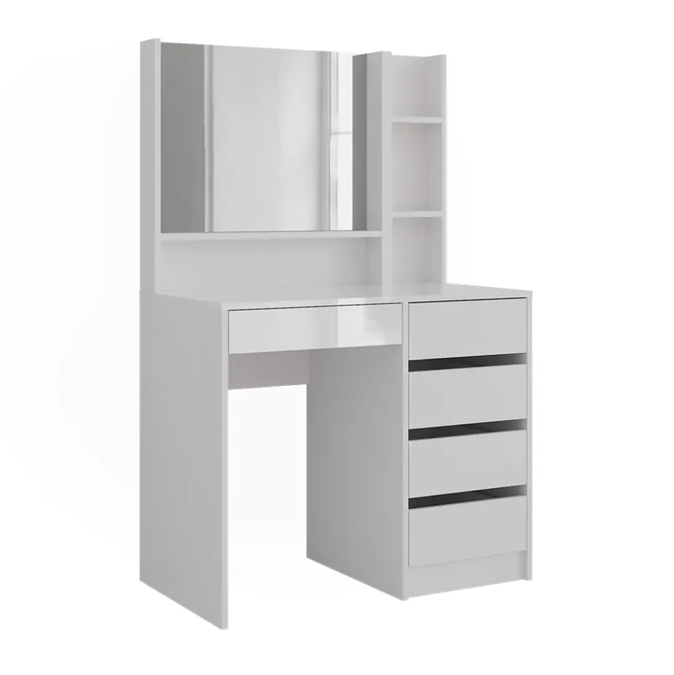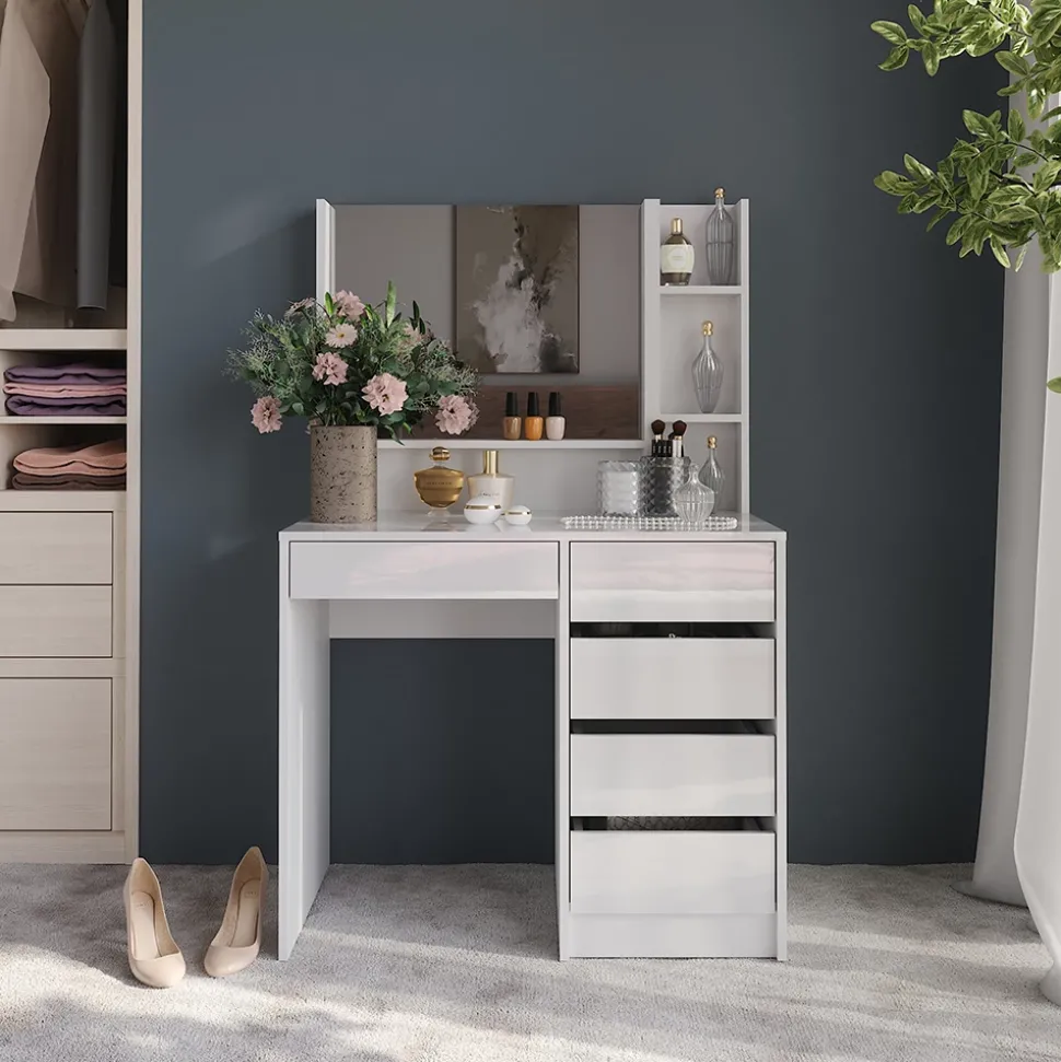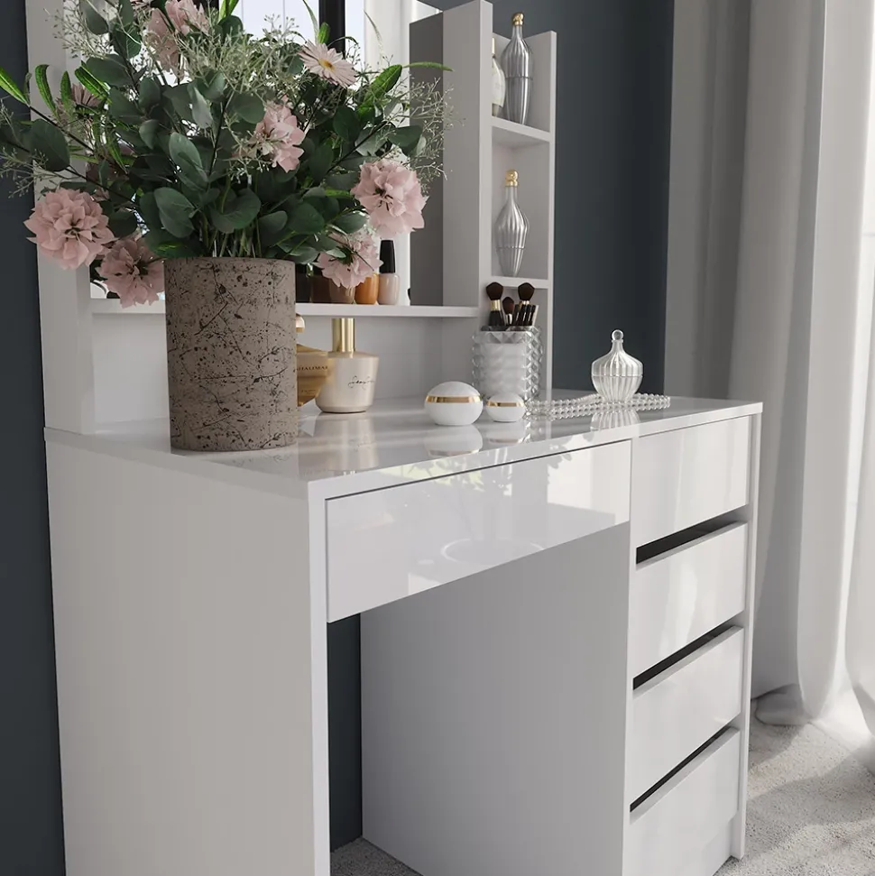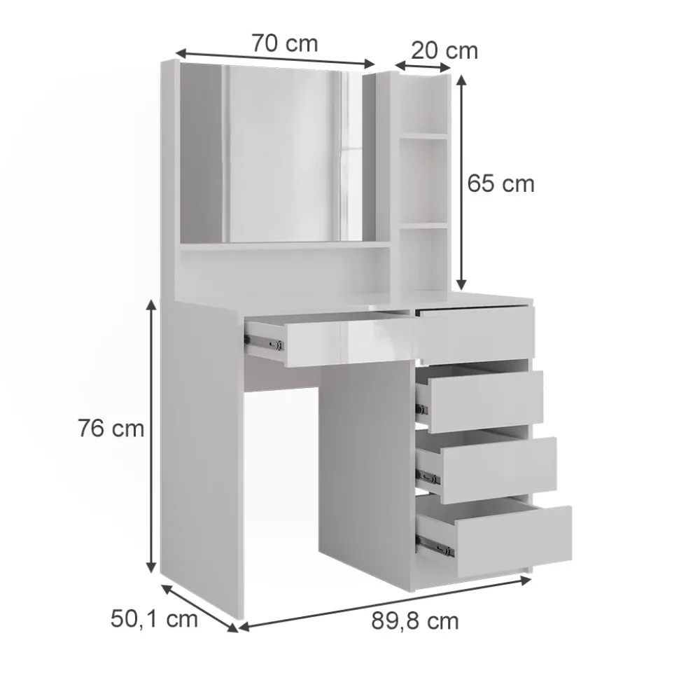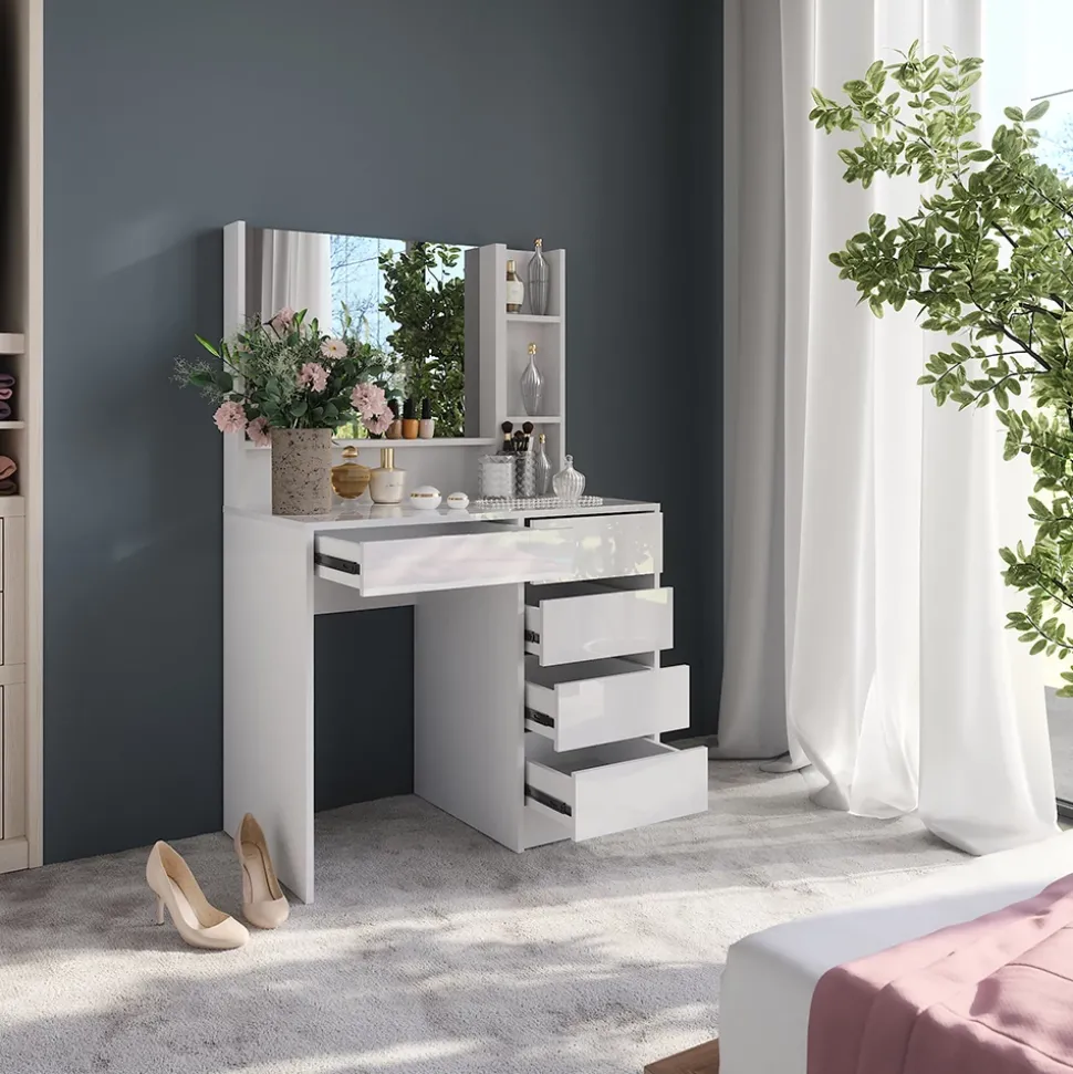 - Der Kosmetiktisch bietet dir mit großem Spiegel, offenen Regalfächern und vier geräumigen Schubladen viel Platz für all deine Beauty-Produkte.