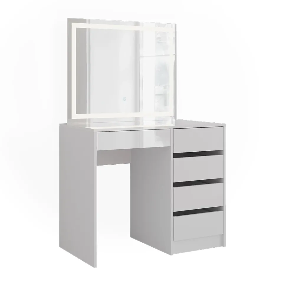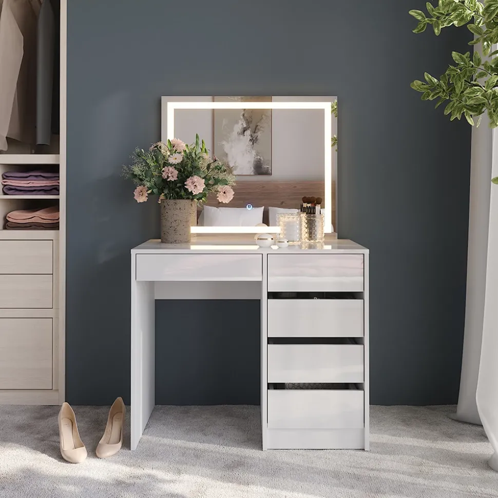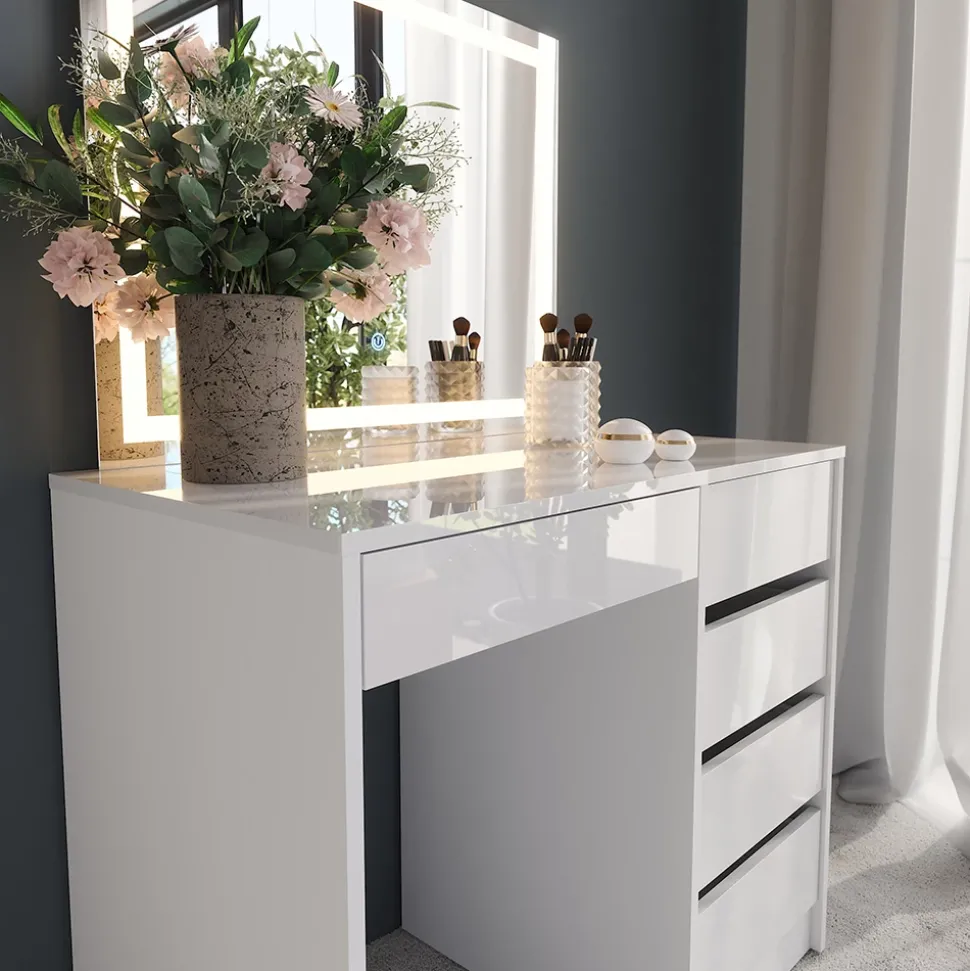 - Die Frisierkommode „Sherry“ besticht durch ihren modernen LED-Spiegel und ein elegantes, minimalistisches Design – perfekt für ein stilvolles Ambiente.