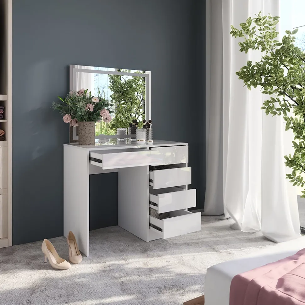 - Der Kosmetiktisch „Sherry“ bietet mit vier Schubladen viel Stauraum für deine Beauty-Produkte und sorgt für Ordnung und Übersicht beim täglichen Styling.