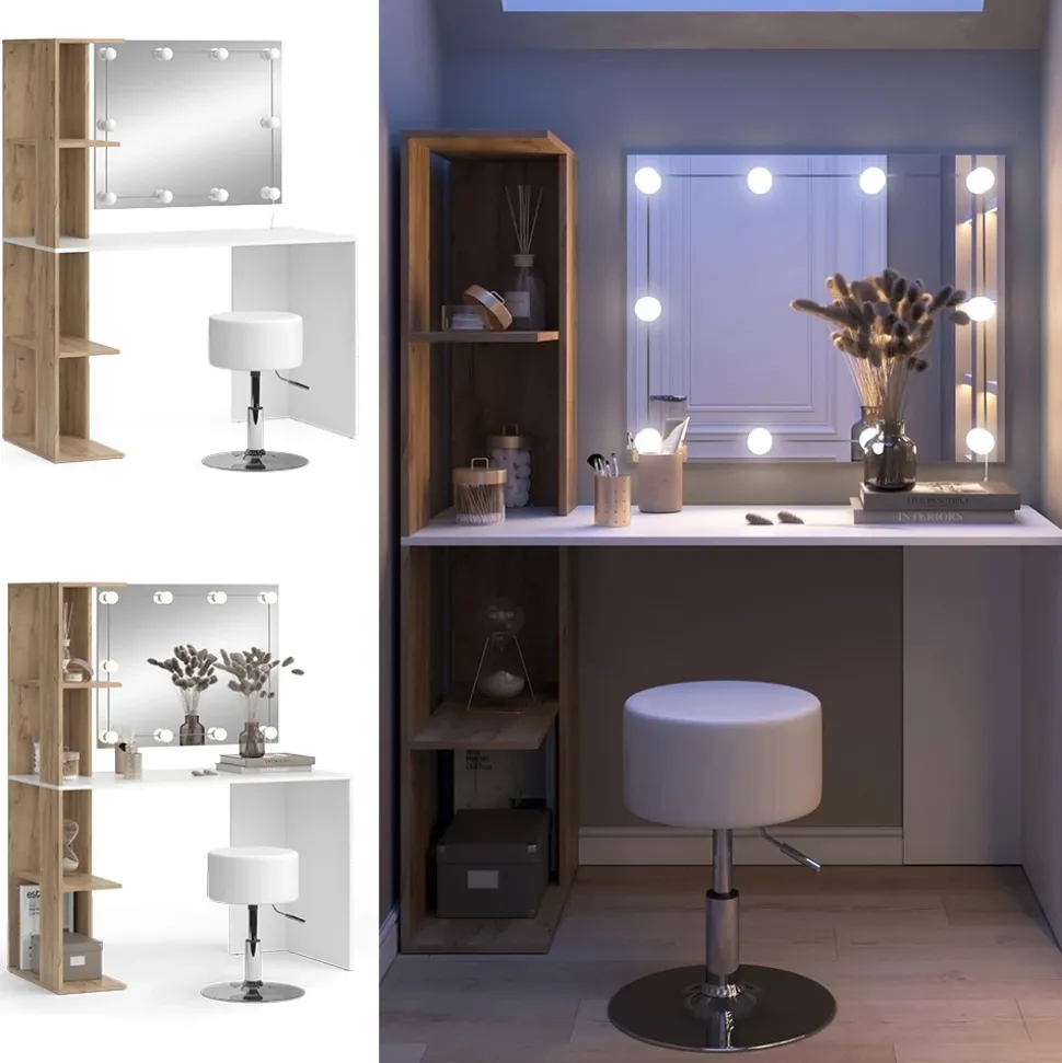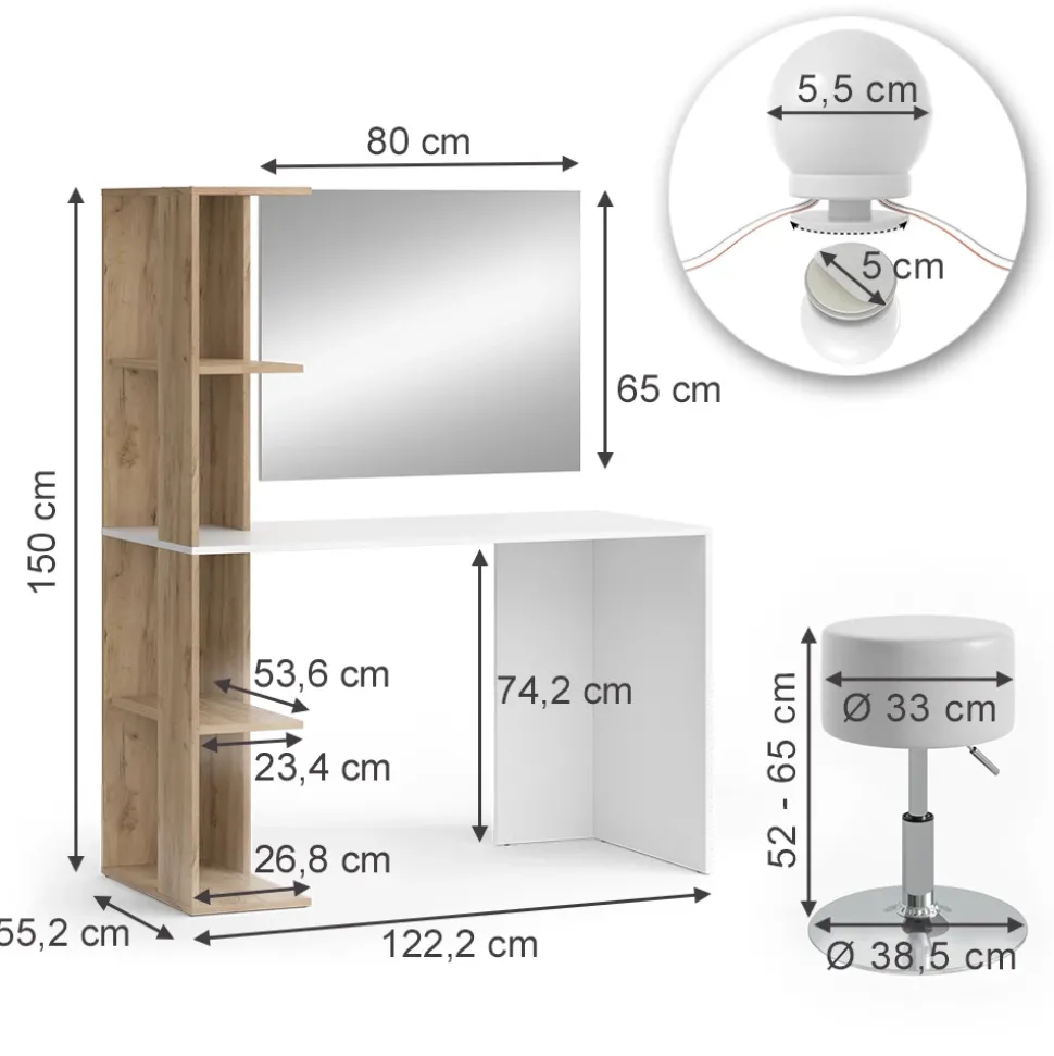 - LIEFERUMFANG: Schminktisch, Spiegel, Hocker, LED-Lichterkette, Montageanleitung, Montagematerial.