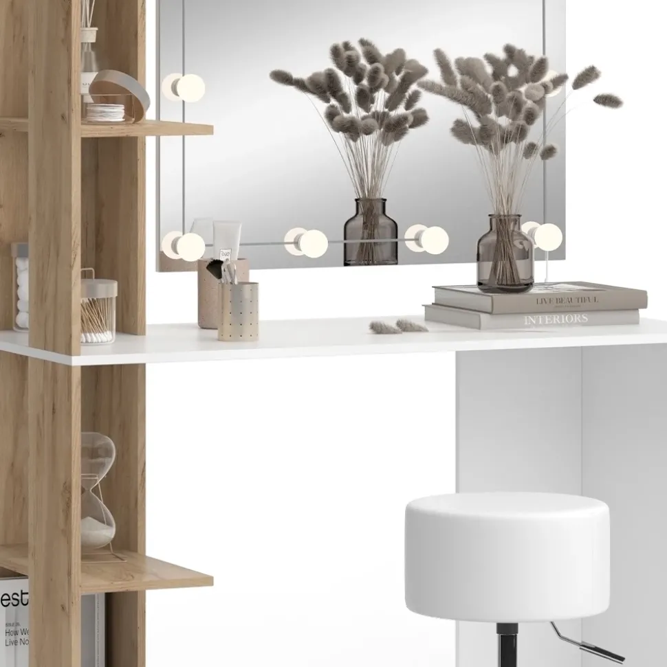 - Der Frisiertisch mit Spiegel verfügt über ein praktisches Seitenregal mit 4 Fächern, das ideal für kleine Räume geeignet ist. Zudem bietet er einen bequemen Schminkplatz für das tägliche Styling.