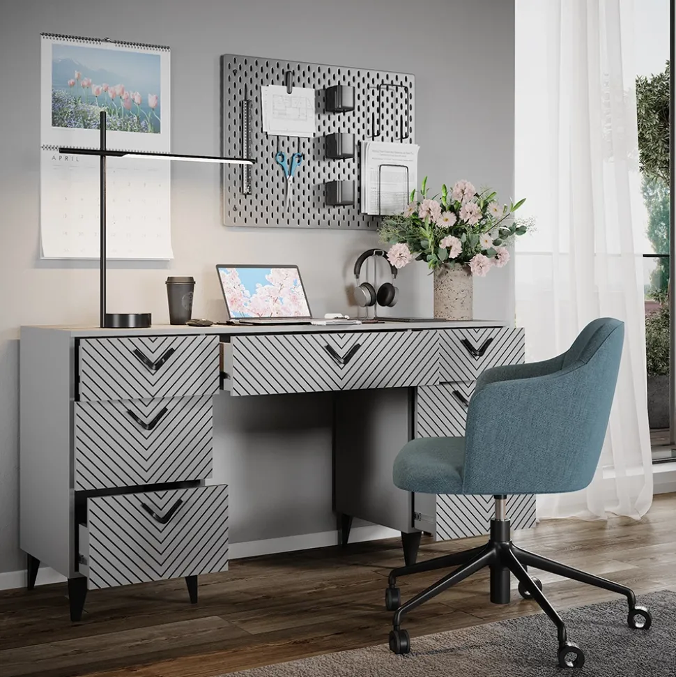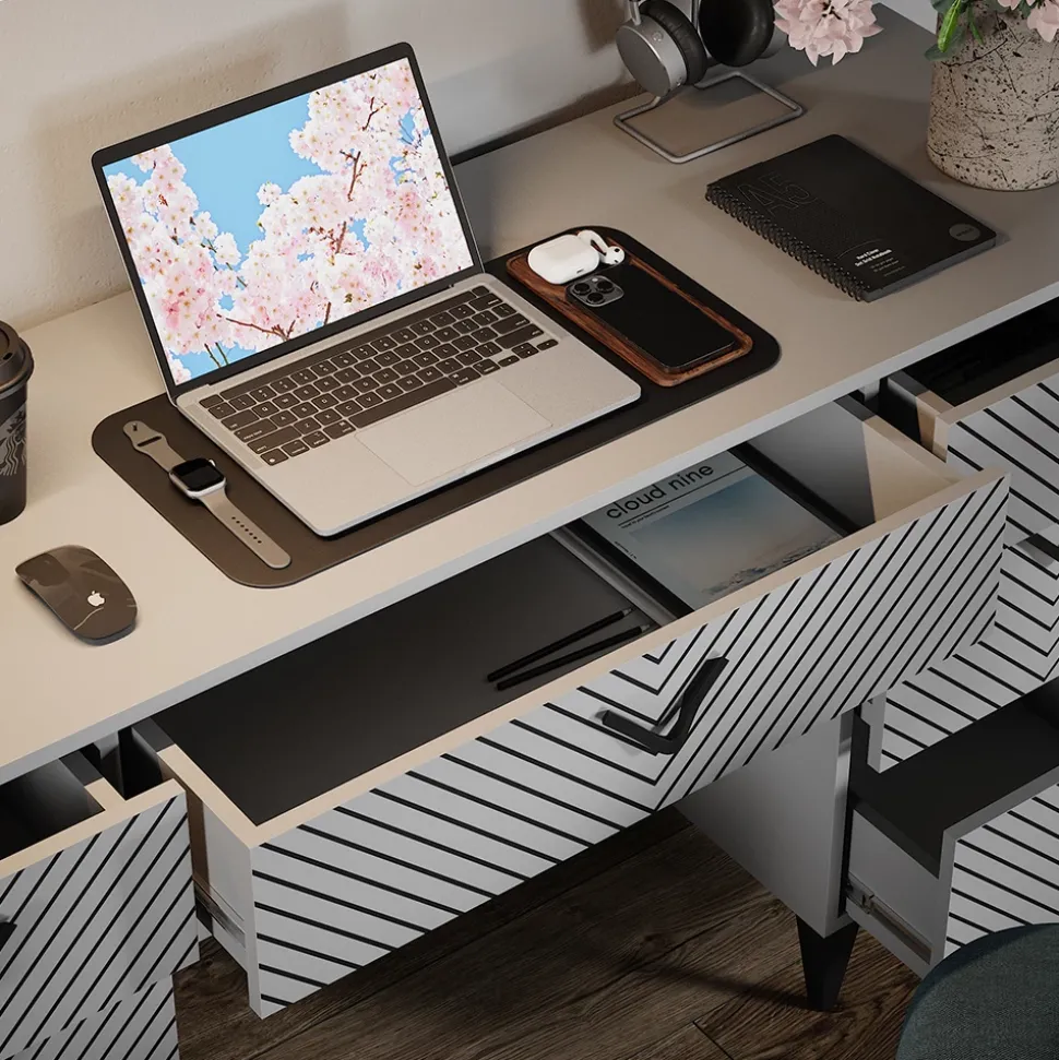 - Der Arbeitstisch für das Büro bietet ein funktionelles Design und viel Stauraum, um Ihre Arbeitsumgebung aufgeräumt zu halten. Das Siebdruck-Motiv verleiht dem Schreibtisch eine persönliche Note.