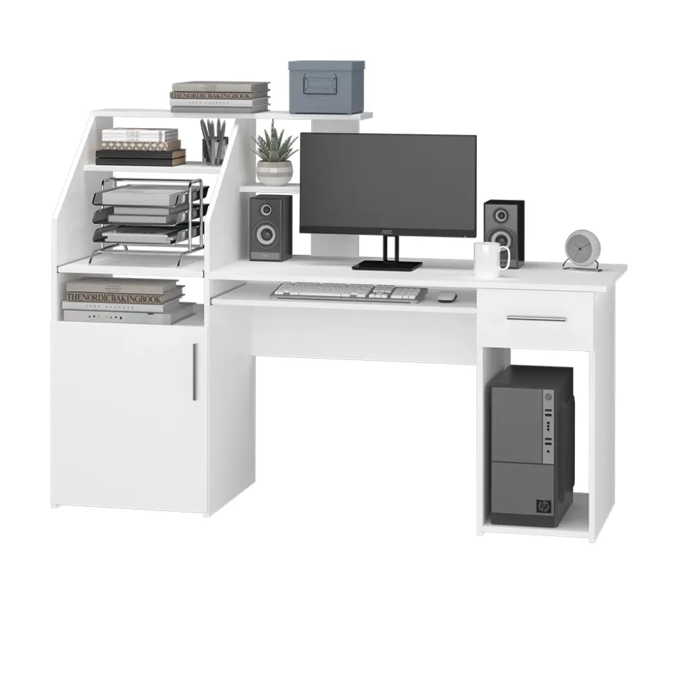 - Der Arbeitstisch für das Büro bietet eine ausziehbare Schublade und offene Regale für die Aufbewahrung von Arbeitsmaterialien sowie ein Regal für die Systemeinheit.