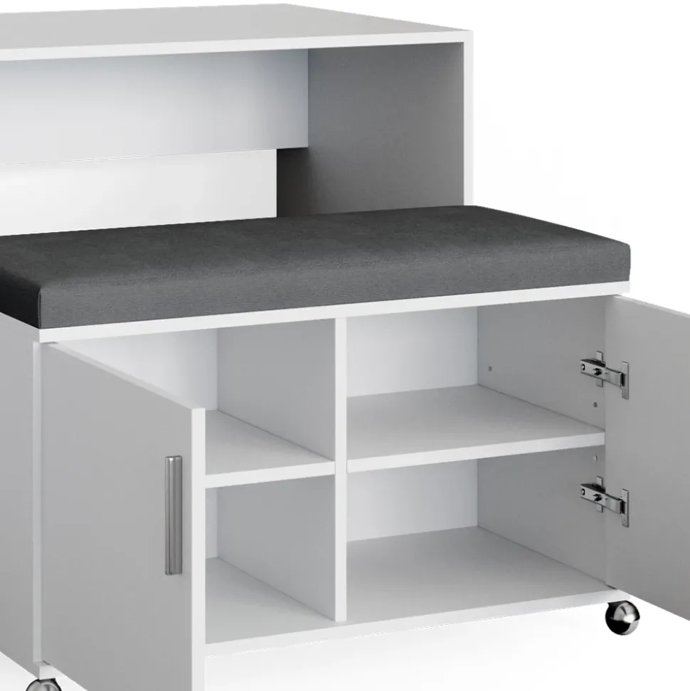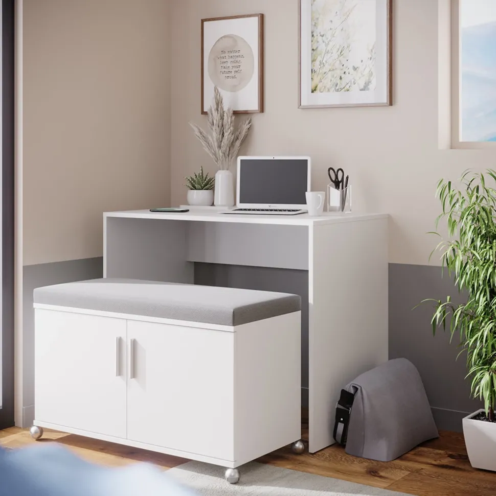 - Der Arbeitstisch für das Büro ist die ideale Wahl für kleine Räume, da er über einen ausziehbaren Sockel-Sitz und vier geschlossene Ablagen verfügt.