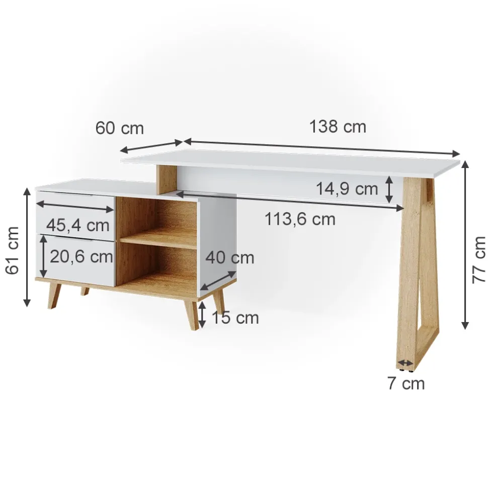 - MAßE: Der Bürotisch mit Stauraum hat eine Breite von 138 cm, eine Höhe von 77 cm und eine Tiefe von 60 cm. Alle detaillierten Größen sind auf den Fotos angegeben.