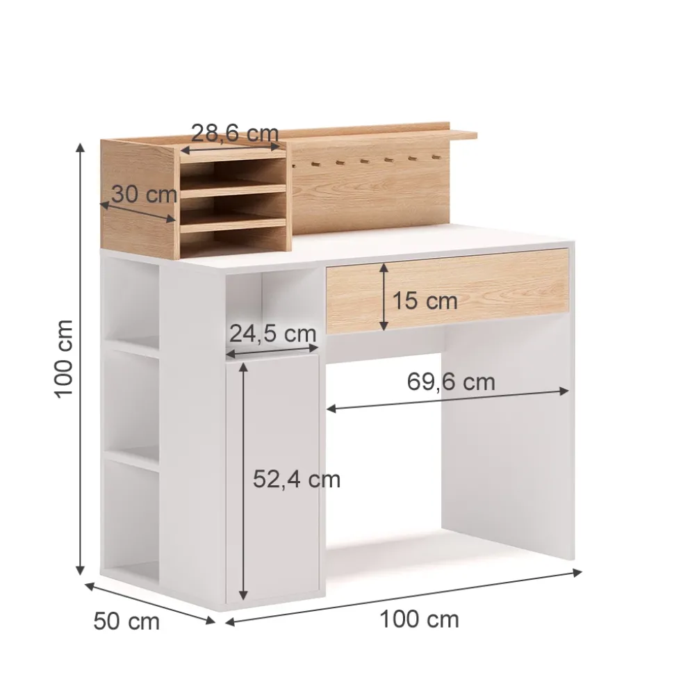 - MAßE: Der Bürotisch mit Stauraum hat eine Breite von 100 cm, eine Höhe von 100 cm und eine Tiefe von 50 cm. Alle detaillierten Größen sind auf den Fotos angegeben.
