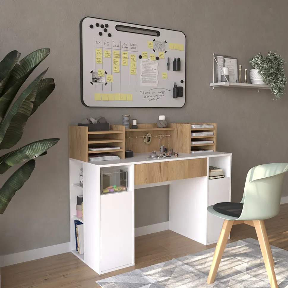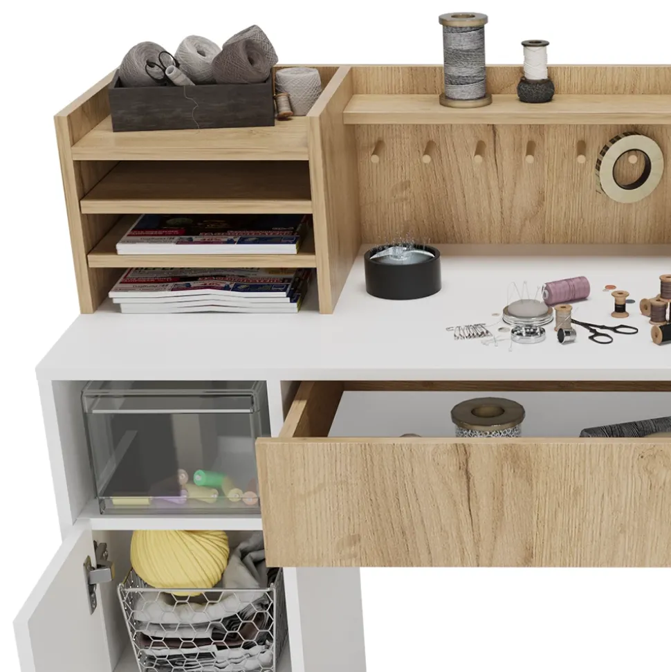 - Optimieren Sie Ihren Arbeitsplatz mit dem Vicco Basteltisch XL in Weiß-Sonoma. Offene Regale, Türen und ein Schubfach bieten eine effiziente Organisation im Arbeits-, Hobby- oder Kinderzimmer.