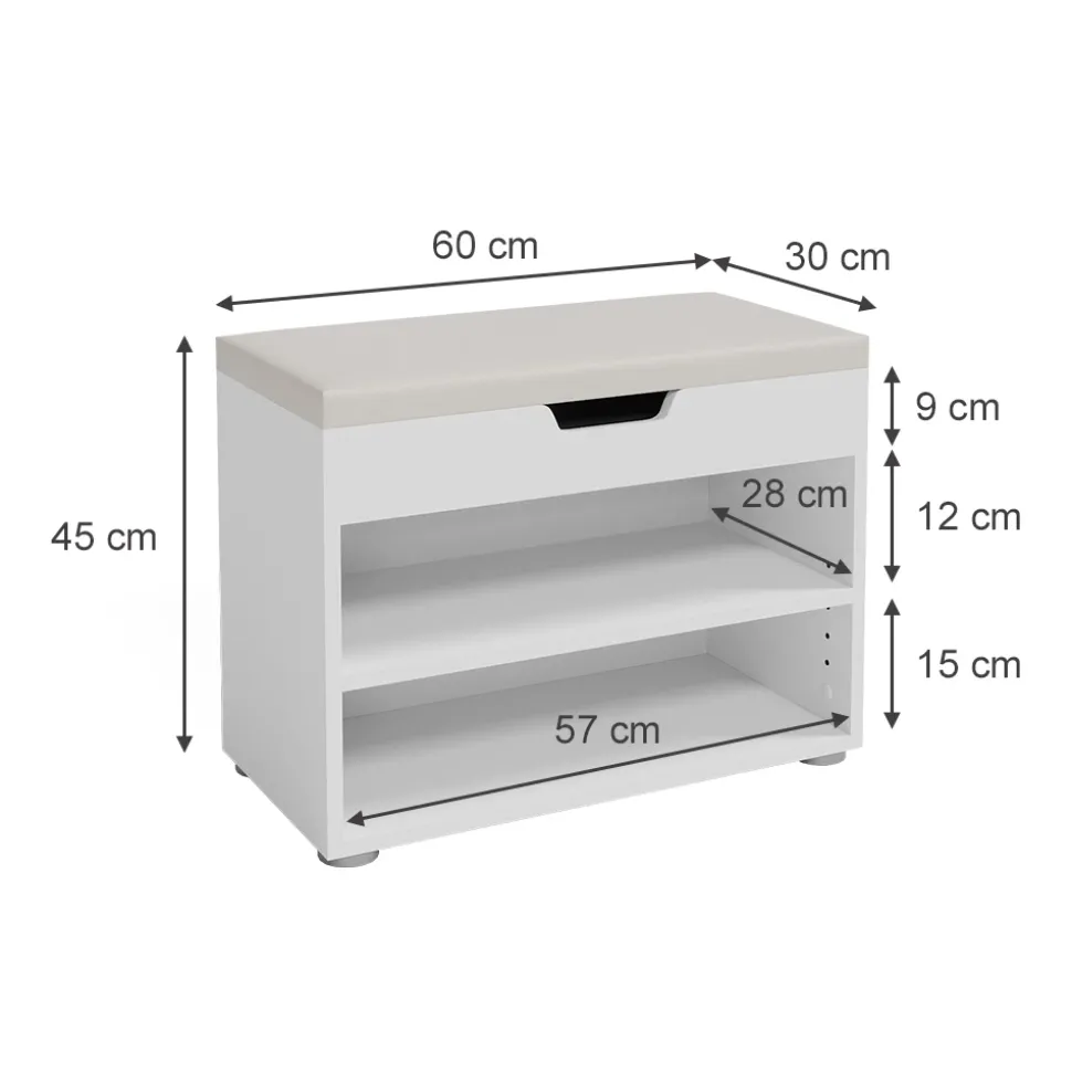- MAßE: Der Schuhschrank mit Sitzbank hat eine Breite von 60 cm, eine Höhe von 45 cm und eine Tiefe von 30 cm. Alle detaillierten Größen sind auf den Fotos angegeben.