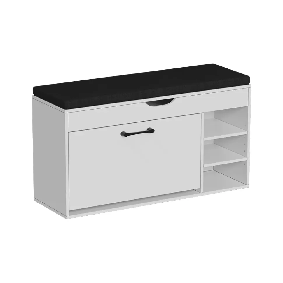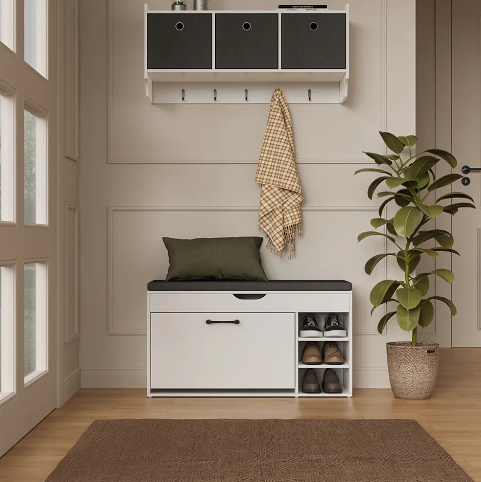 - Verleihen Sie Ihrem Raum mit dieser stilvollen Sitzbank mit Stauraum eine moderne Note. Die drei offenen Fächer und das praktische Ablagefach bieten ausreichend Platz für Ihre persönlichen Gegenstände