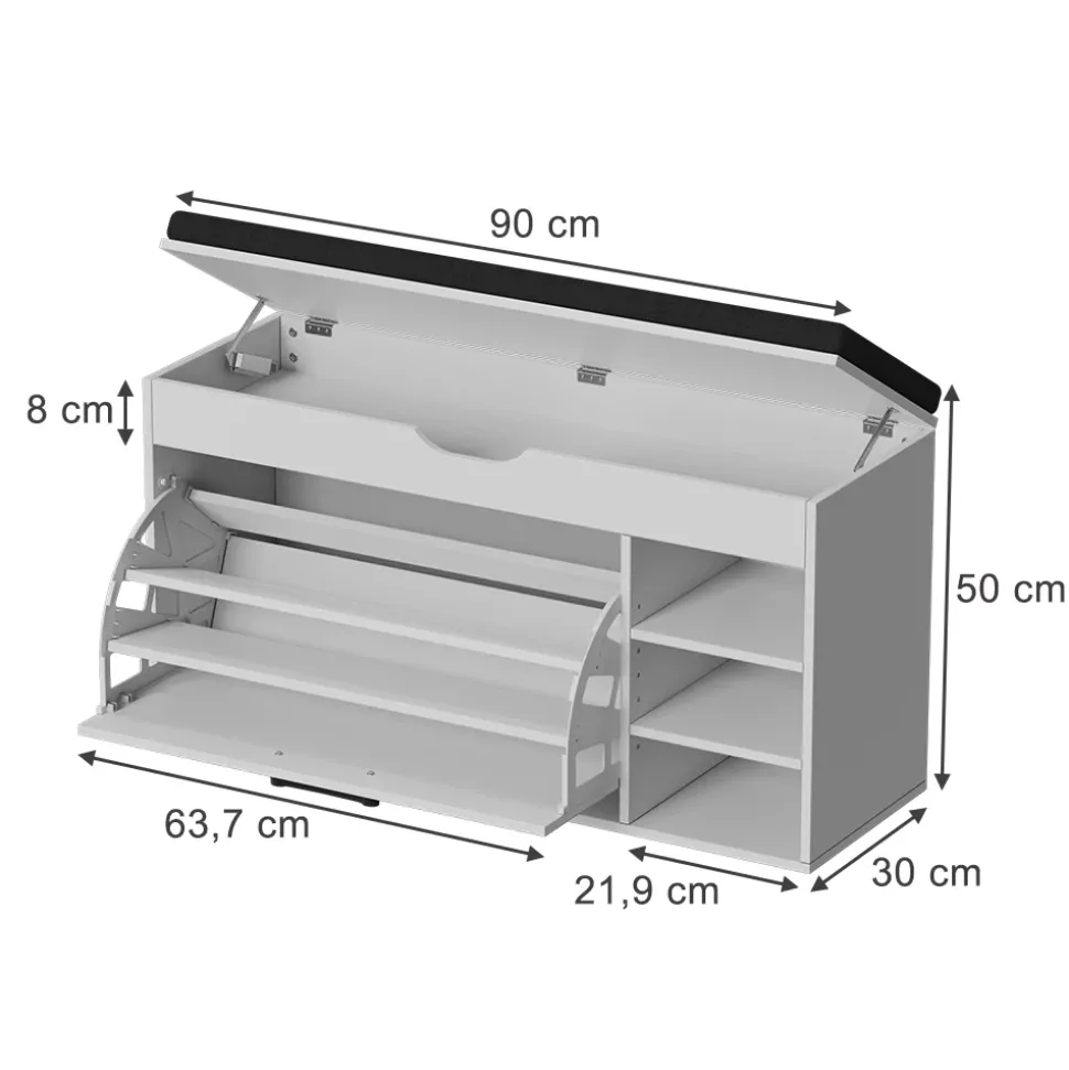 - MAßE: Der Schuhschrank mit Sitzbank hat eine Tiefe von 30 cm, eine Breite von 90 cm und eine Höhe von 50 cm. Die detaillierten Größen sind auch auf den Fotos angegeben.