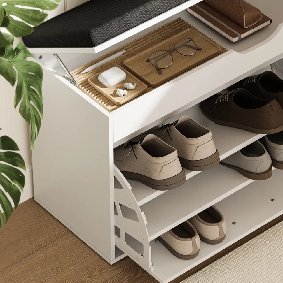 - MATERIAL: Das Schuhregal mit Sitzfläche besteht aus robuster MDF (12 mm), die pflegeleicht ist und sich leicht mit einem feuchten Tuch reinigen lässt.