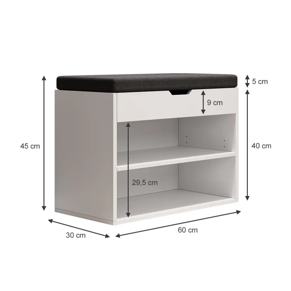 - MAßE: Der Schuhschrank mit Sitzbank hat folgende Abmessungen: Breite: 60 cm, Höhe: 45 cm, Tiefe: 30 cm. Alle detaillierten Größen sind auf den Fotos angegeben.