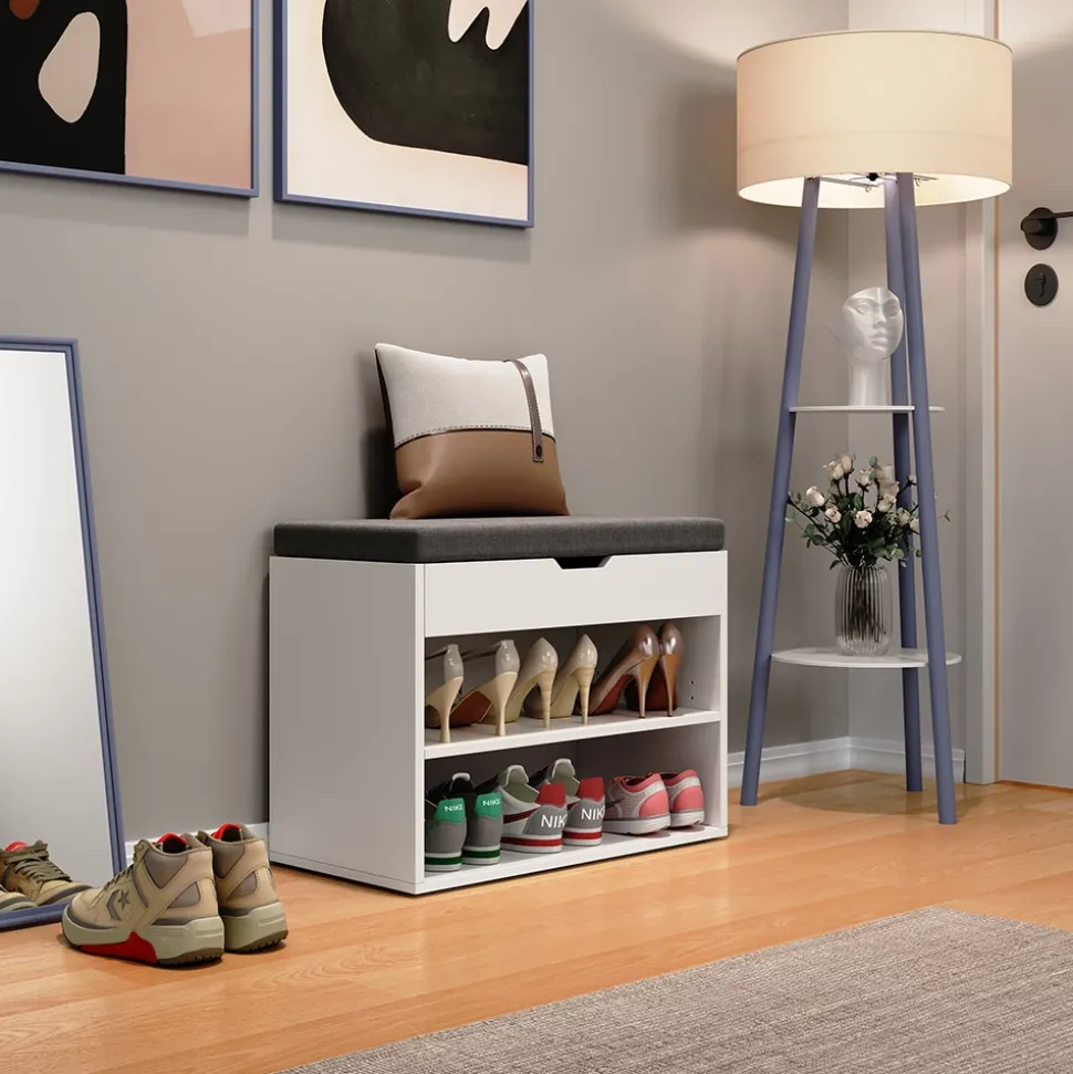 - Mit ihrer schlichten Optik und modernem Design vereint das Schuhregal Ästhetik mit Funktionalität und dient gleichzeitig als bequeme Sitzgelegenheit mit Auflage.
