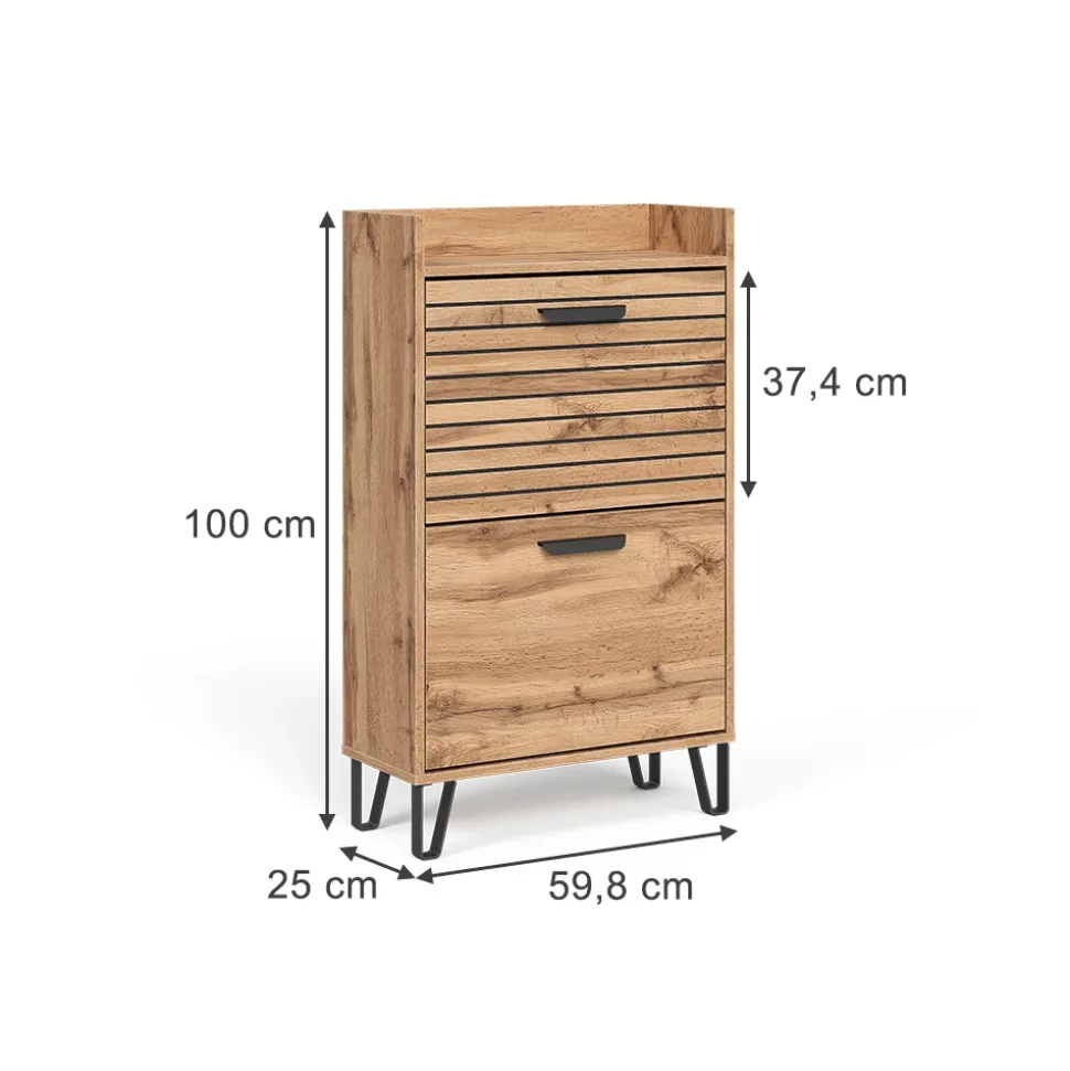 - MAßE: Der Schuhschrank hat eine Höhe von 100 cm, eine Breite von 59,8 cm und eine Tiefe von 25 cm. Die detaillierten Größen sind auf den Fotos angegeben.