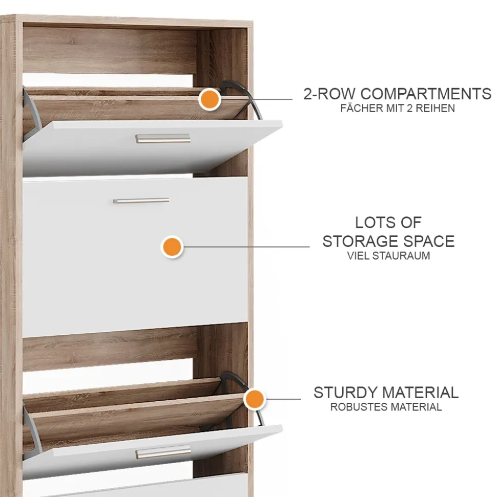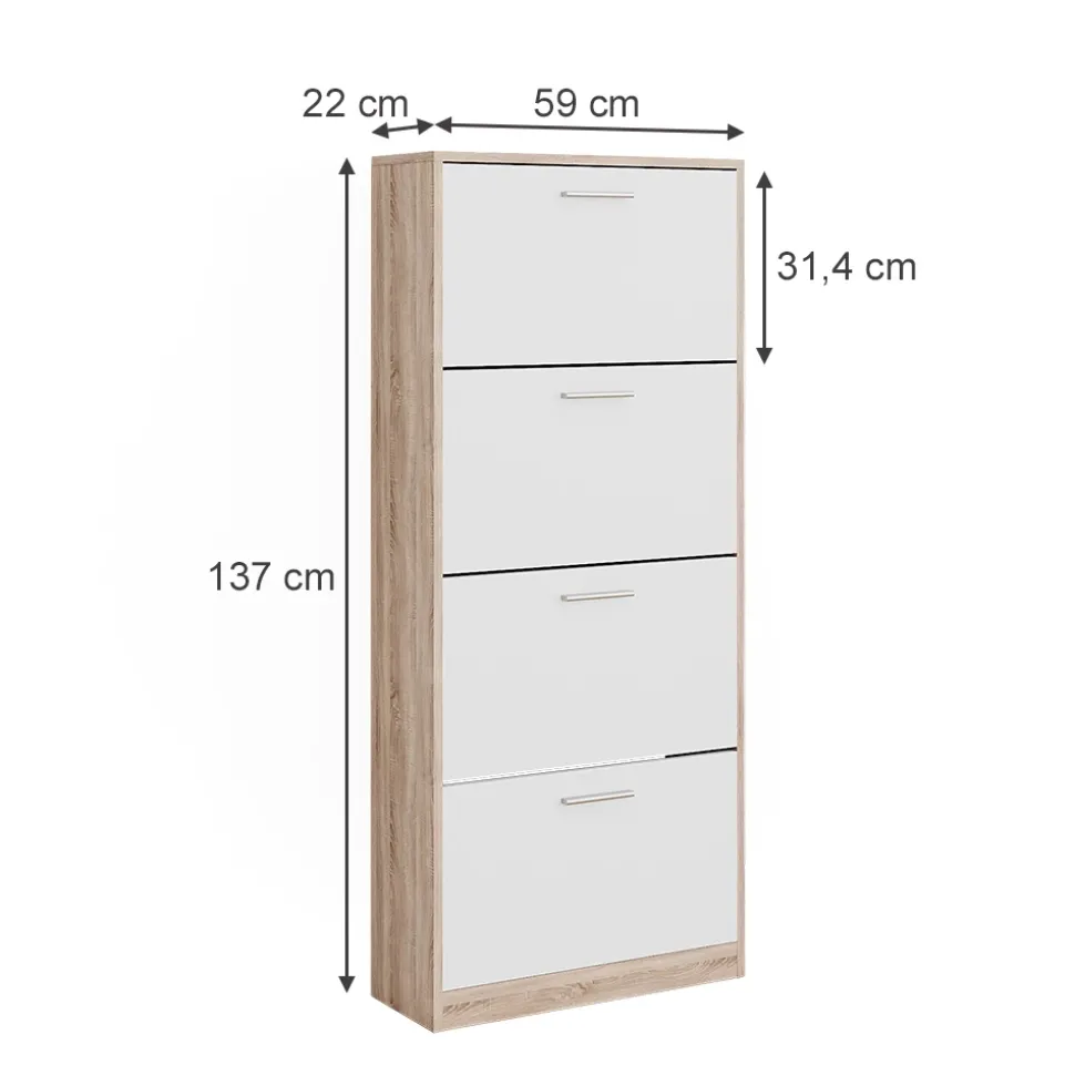 - MAßE: Der Schuhschrank hat folgende Abmessungen: Tiefe: 22 cm, Breite: 59 cm und Höhe: 137 cm. Alle detaillierten Größen sind auf den Fotos angegeben.