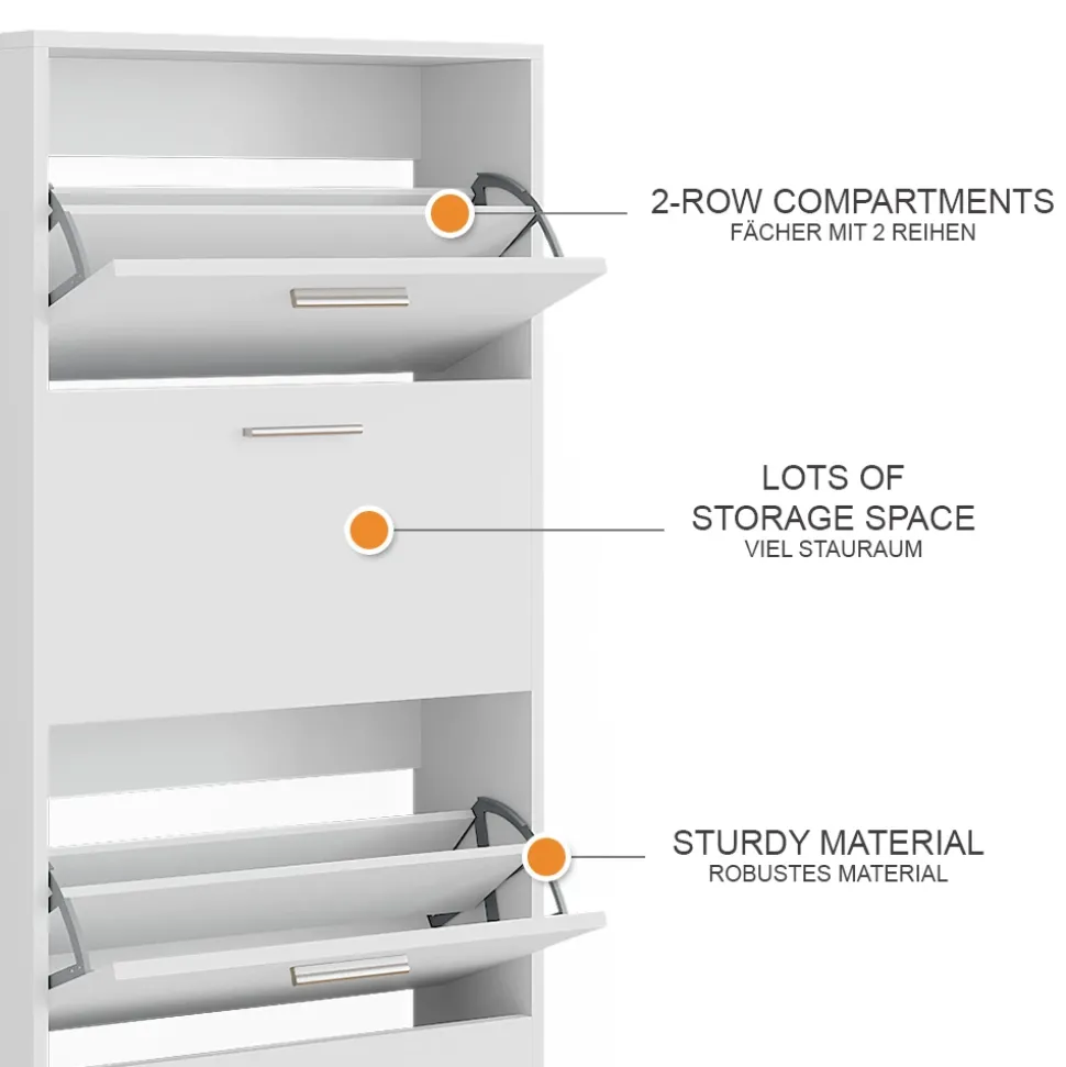 - MAßE: Der Schuhschrank hat folgende Abmessungen: Tiefe: 22 cm, Breite: 59 cm und Höhe: 137 cm. Alle detaillierten Größen sind auf den Fotos angegeben.