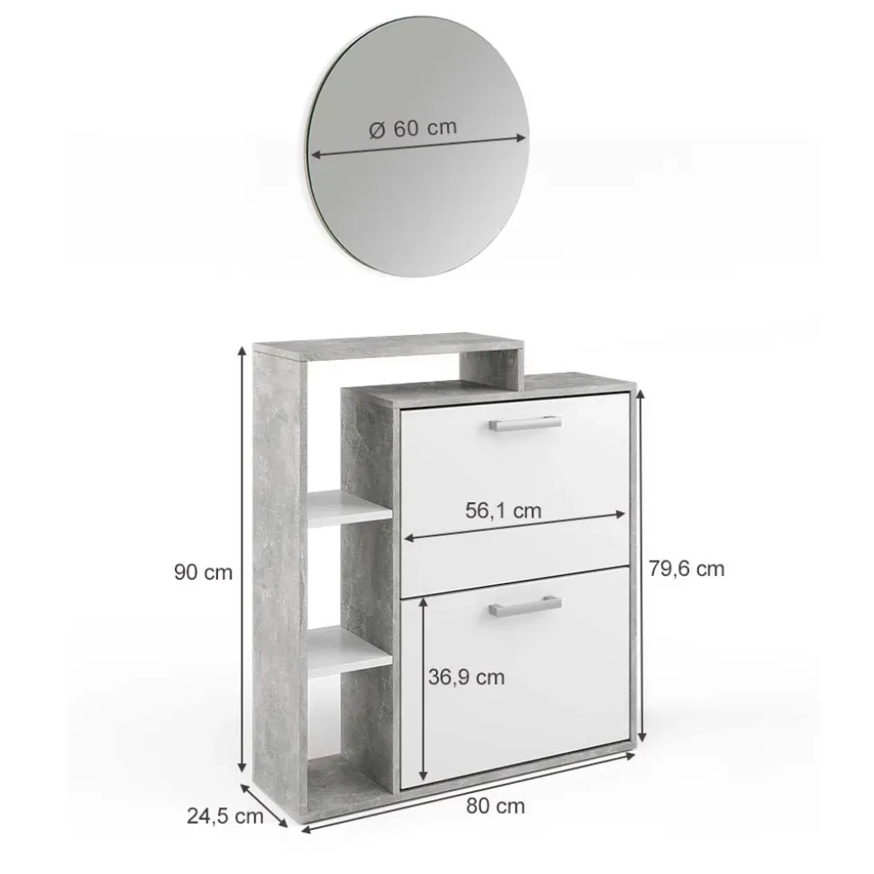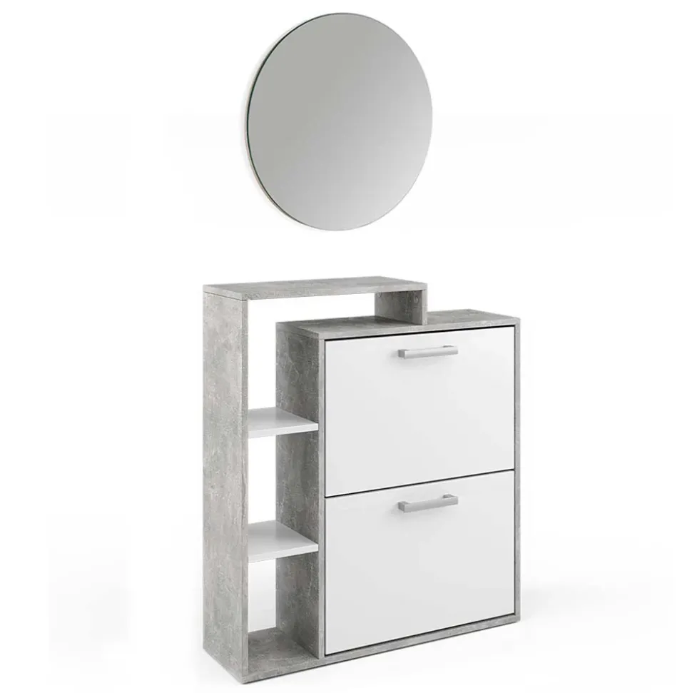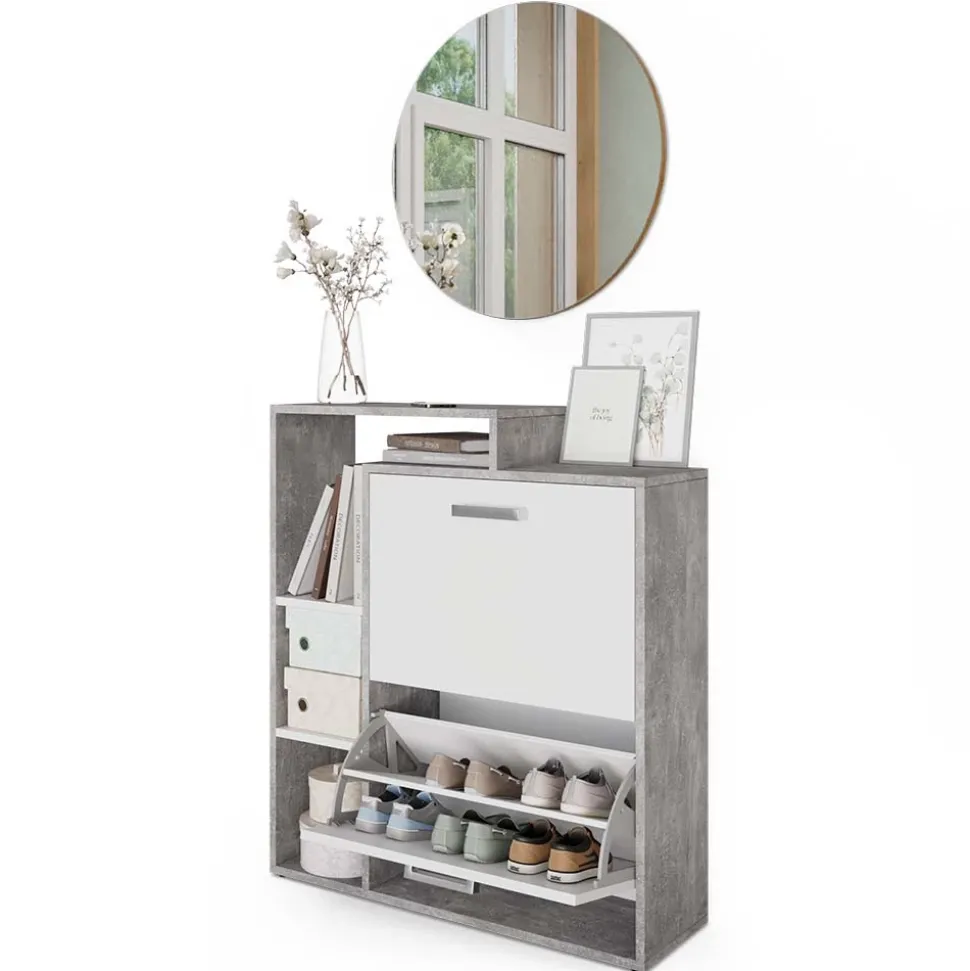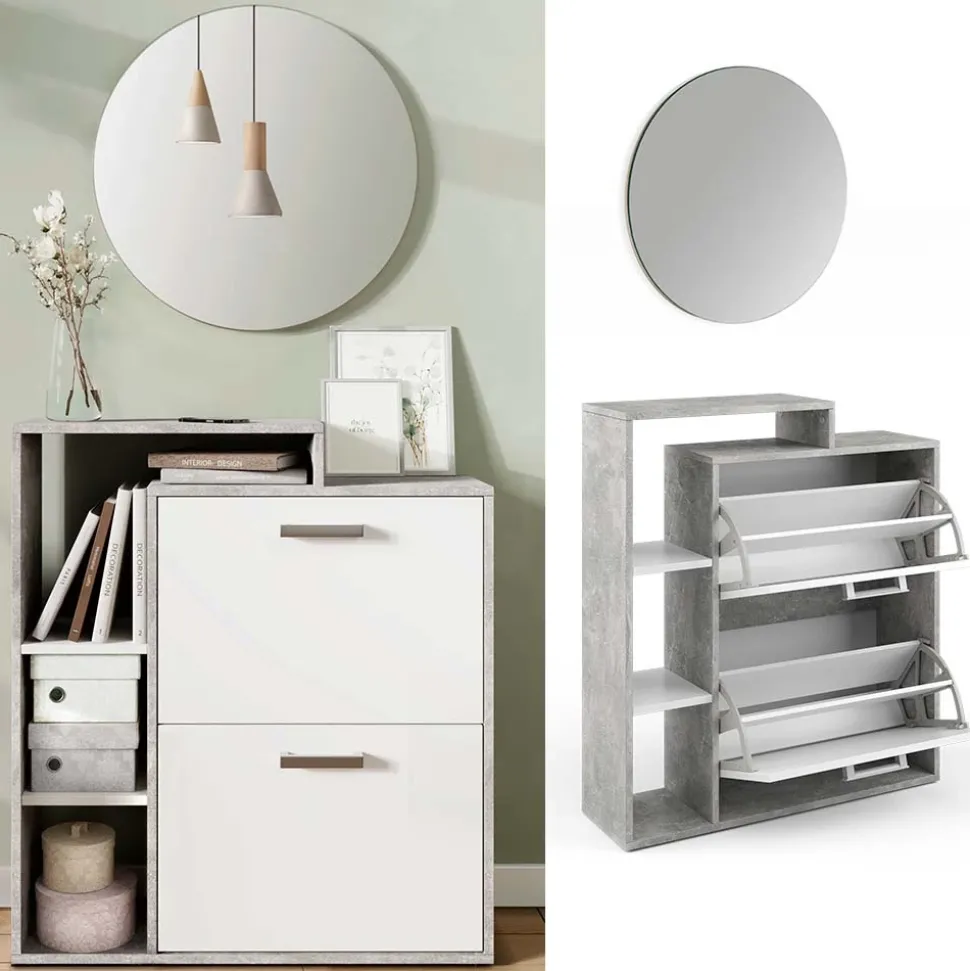 - Das Schuhregal bietet reichlich Stauraum mit zwei klappbaren Regalen und verfügt über einen runden Spiegel.