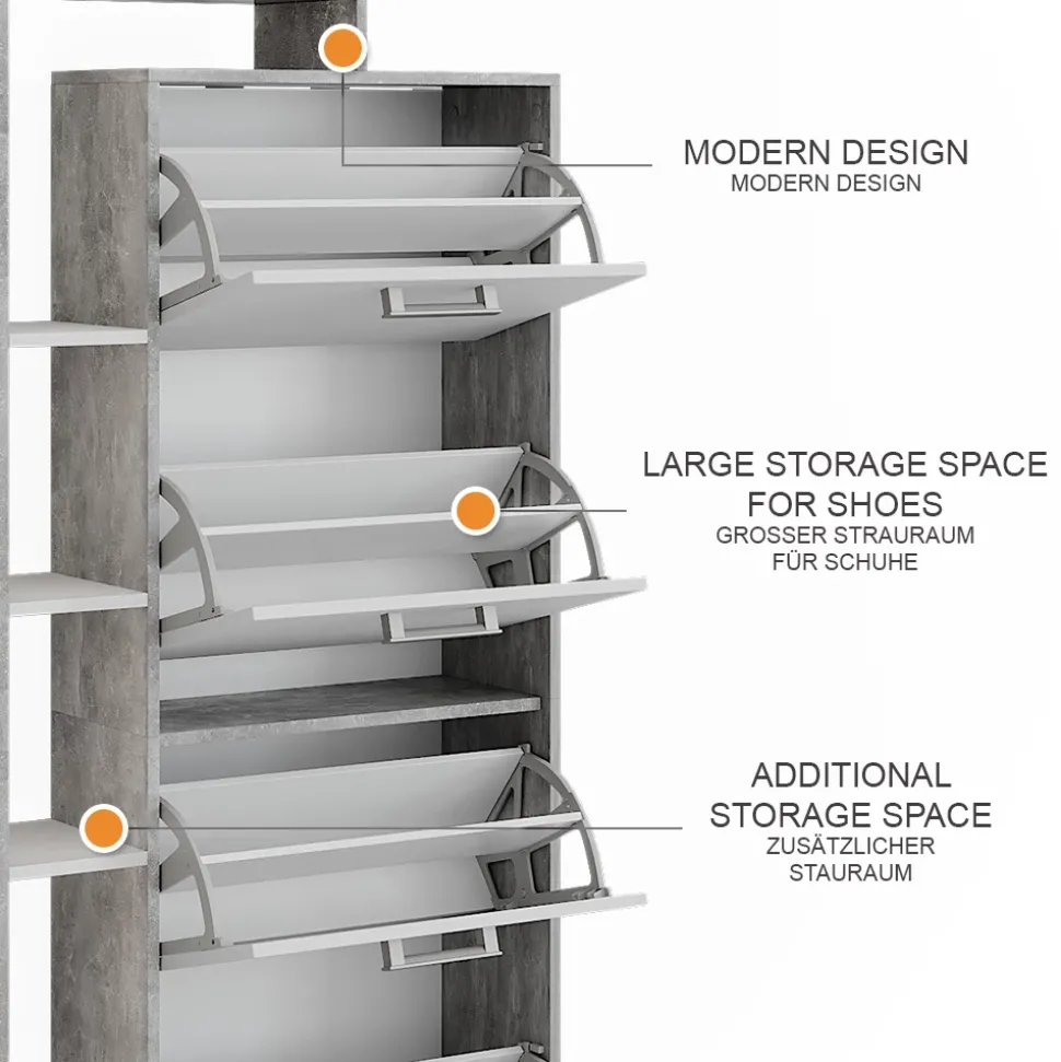 Mit dem Schuhkipper Orlando bekommen Sie nicht nur einen praktischen Schuhschrank für Ihren Flur, sondern auch ein modernes Möbelstück, das Ihr Zuhause aufwertet. Nie wieder chaotische Schuhberge im Eingangsbereich! Der Schuhkipper bietet genug Platz für all Ihre Lieblingsschuhe und sorgt für Ordnung und Übersichtlichkeit. Gönnen Sie sich dieses funktionale und stilvolle Möbelstück und machen Sie Ihren Flur zu einem einladenden und aufgeräumten Bereich in Ihrem Zuhause. Der Schuhkipper Orlando – ein Must-have für jeden, der Wert auf praktische Lösungen und Ästhetik legt!