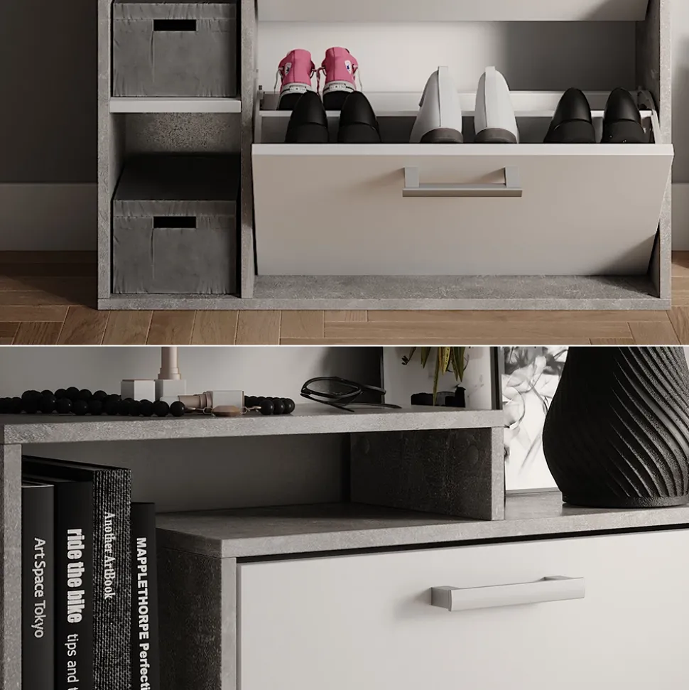 - MAßE: Der Schuhschrank hat eine Tiefe von 24,2 cm, eine Breite von 80 cm und eine Höhe von 128,3 cm.