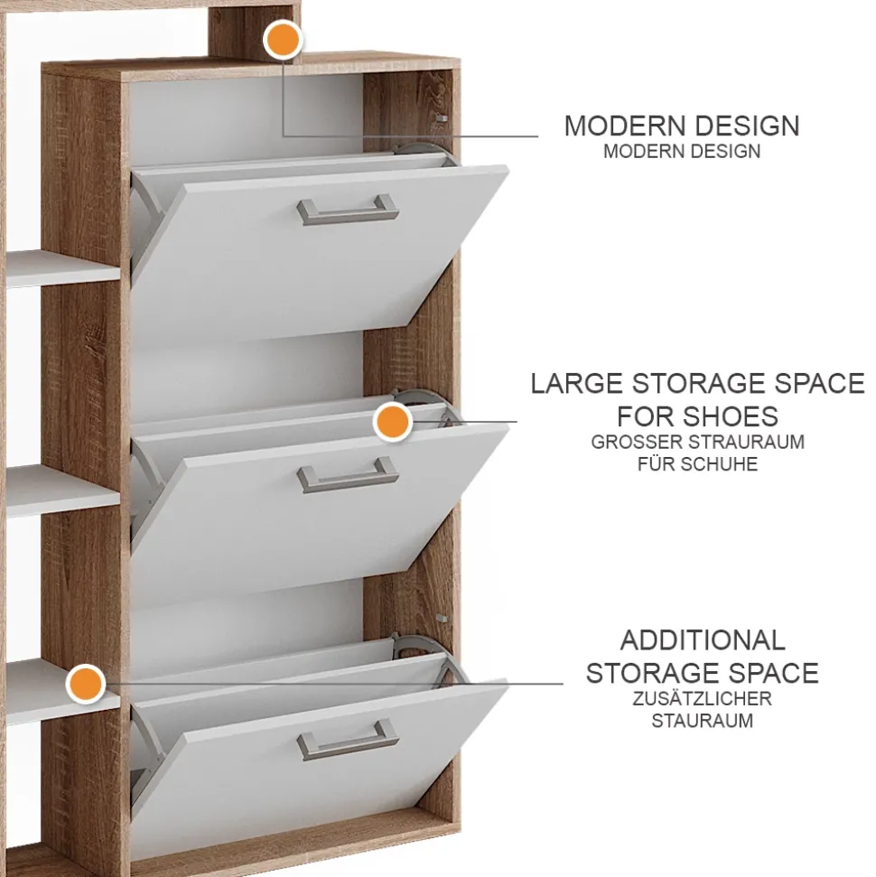 - MAßE: Der Schuhschrank hat eine Tiefe von 24,2 cm, eine Breite von 80 cm und eine Höhe von 128,3 cm.