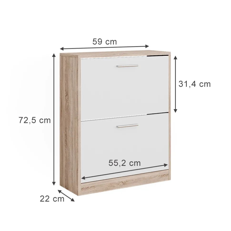 - MAßE: Der Schrank für die Schuhe hat die folgenden Abmessungen: Tiefe von 22 cm, Breite von 59 cm und Höhe von 72,5 cm. Alle detaillierten Größen sind auf den Fotos angegeben.
