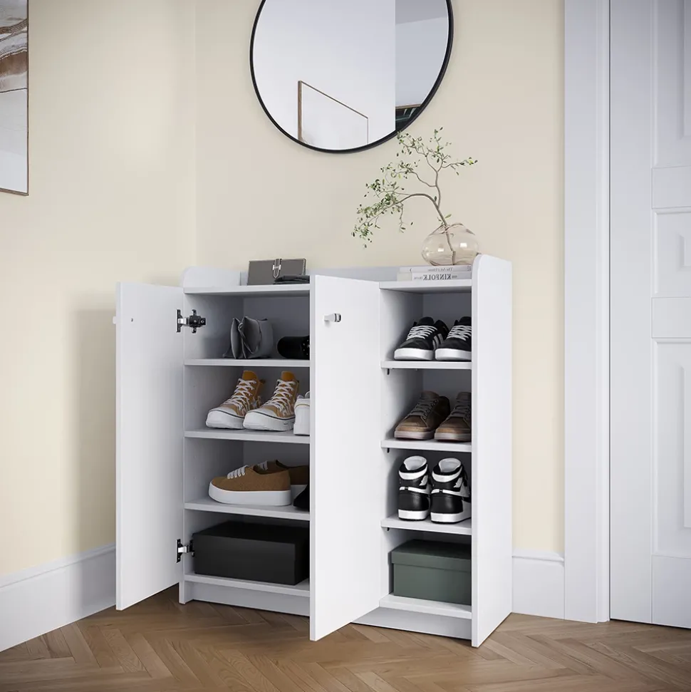 Der Schuhschrank Moritz ist ideal für dezente Einrichtungskonzepte. Er bietet mehrere Ablagen hinter zwei Türen, sodass Schuhe ordentlich verstaut sind und dennoch platzsparend untergebracht werden können.