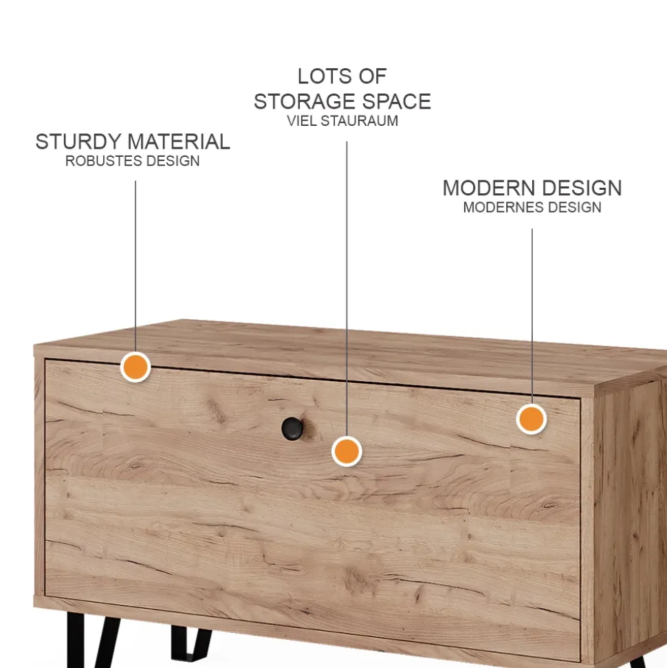 - MATERIAL: Die Schuhbank besteht aus einer pflegeleichten 16 mm Spanplatte. Die Griffe sind aus Plastik und die Füße aus Metall gefertigt.