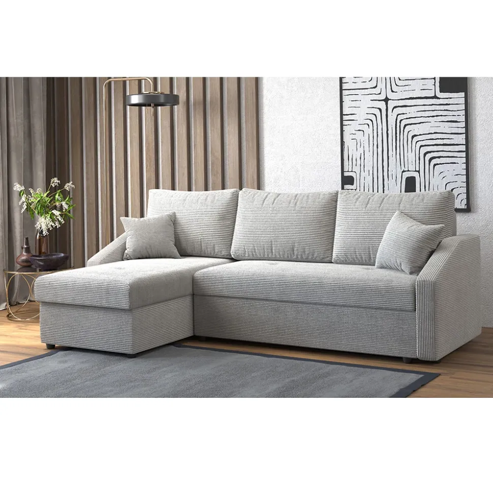 - MATERIAL: Das Sofa in L-Form besteht aus pflegeleichtem Polyester. Einige Bestandteile des Artikels sind aus Spanplatte gefertigt.