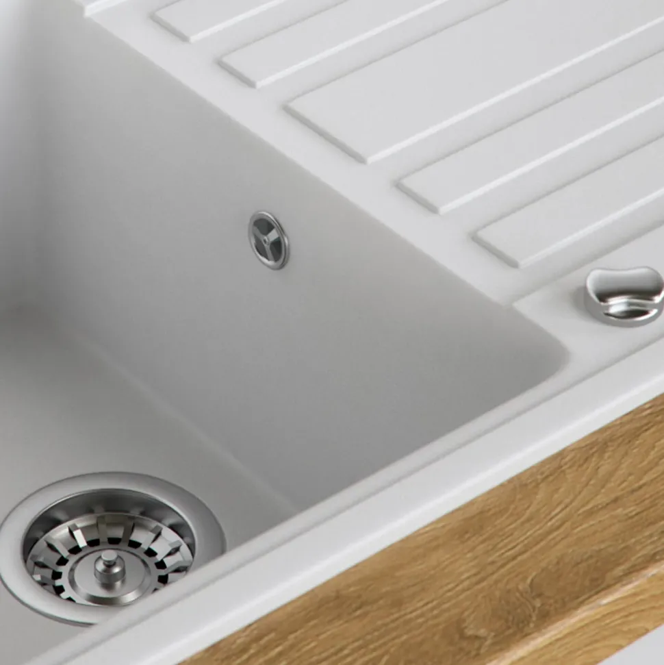 - Die Spüle aus Granit mit abtropfflügel ist widerstandsfähig gegen Chemikalien und stoßsicher, ideal für eine langlebige und robuste Küchenausstattung.