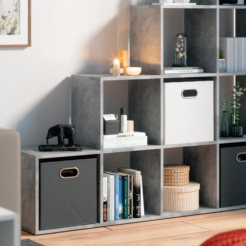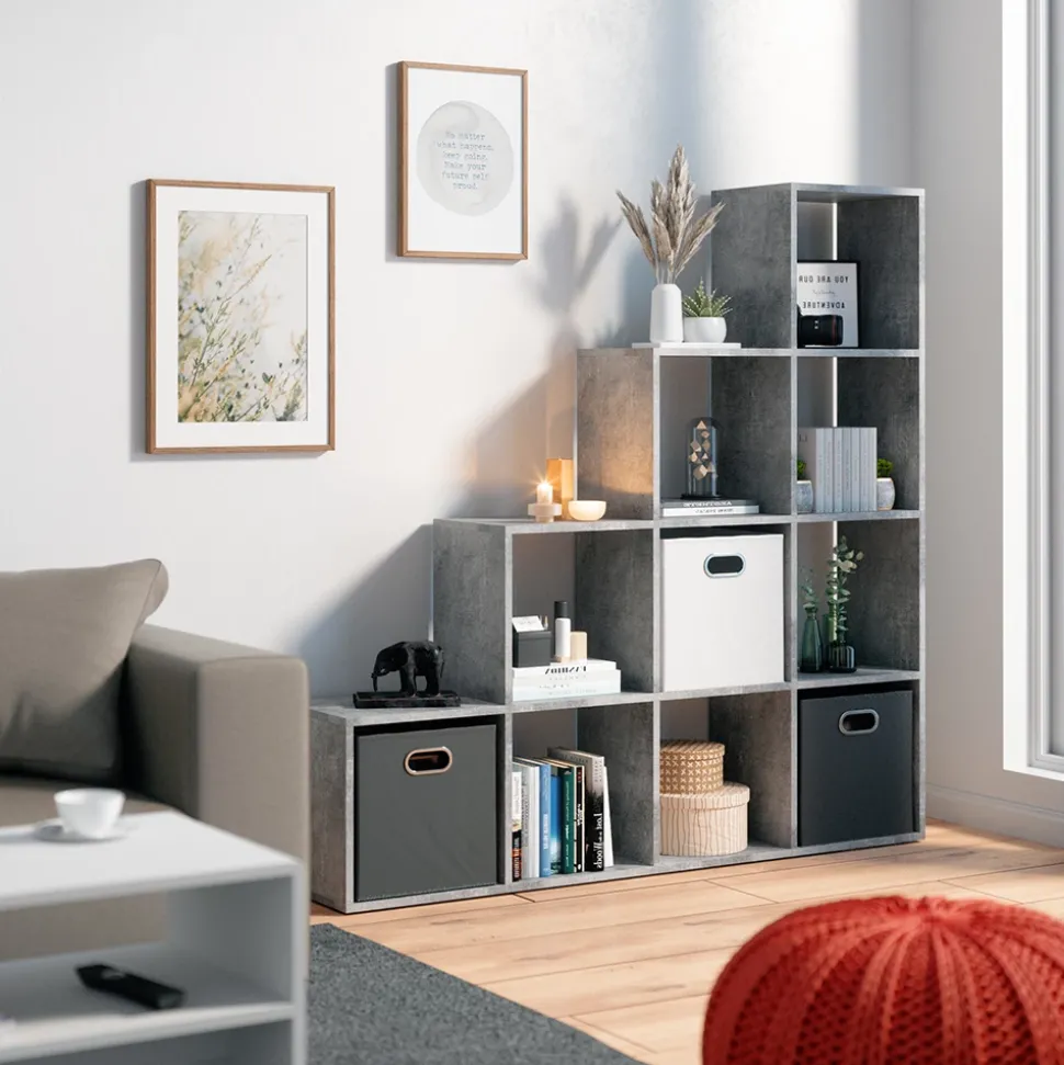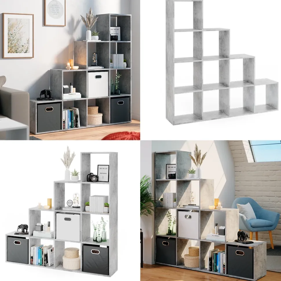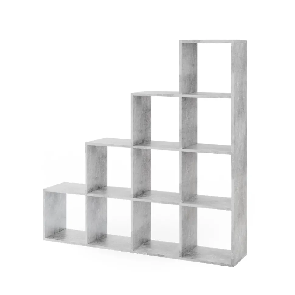 - Das Bücherregal steht aufrecht und bietet Platz für bis zu 10 offene Ablageflächen in kastenförmigen Regalen, die in einer leiterförmigen Anordnung angeordnet sind.