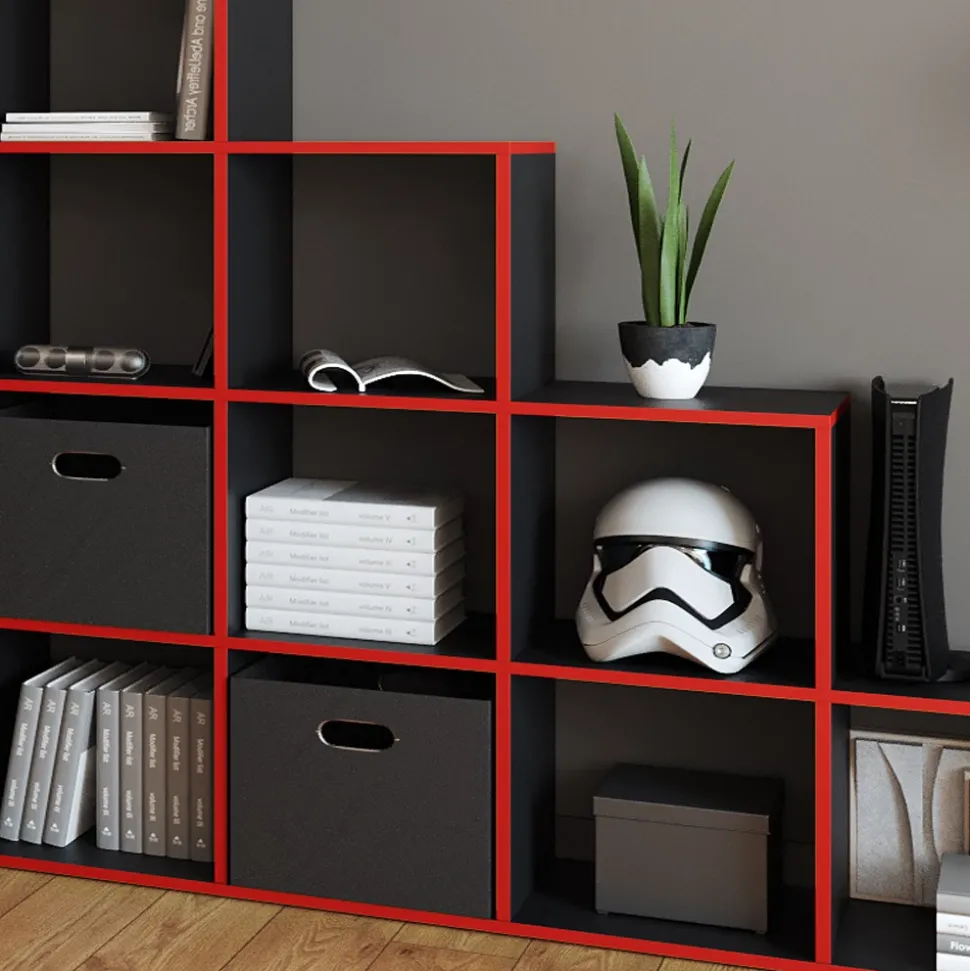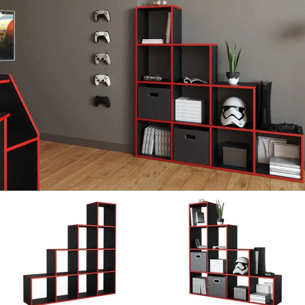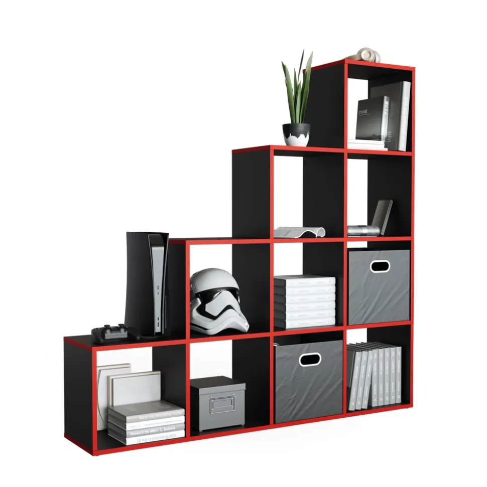 - Das Bücherregal steht aufrecht und bietet Platz für bis zu 10 offene Ablageflächen in kastenförmigen Regalen, die in einer leiterförmigen Anordnung angeordnet sind.