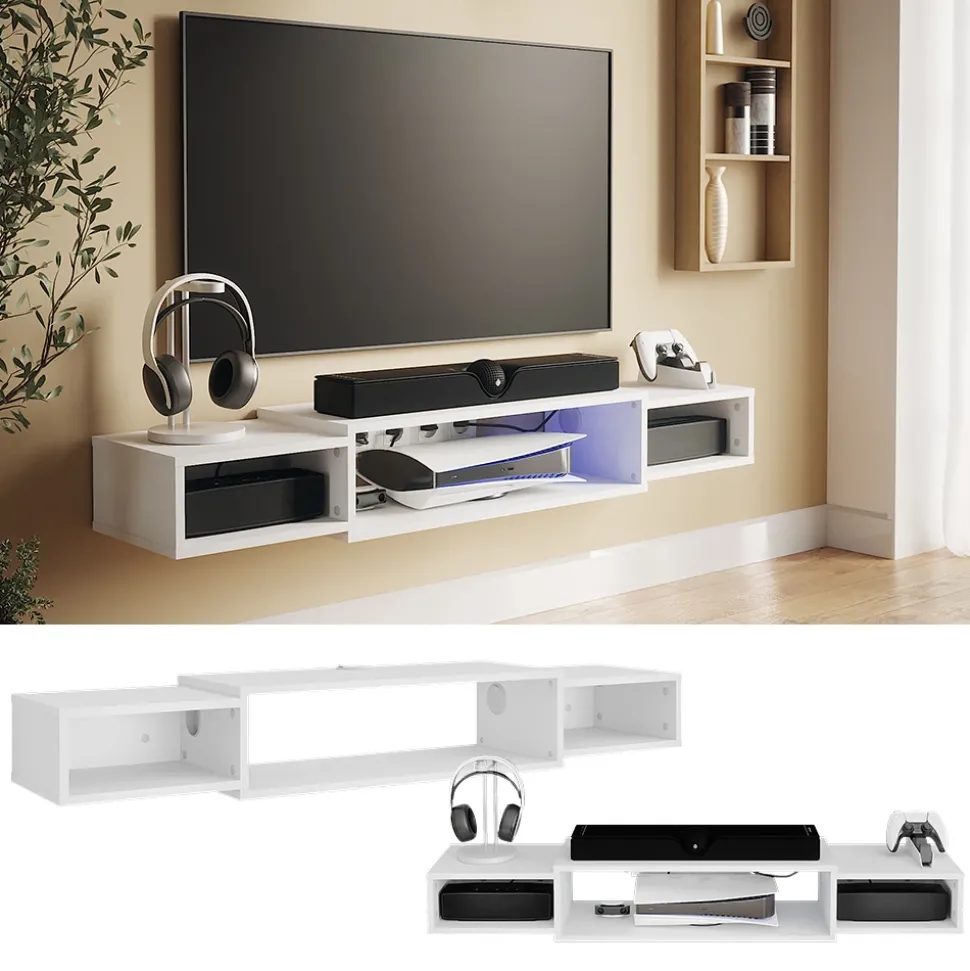 - Dieser Fernsehtisch ist perfekt für das Wohnzimmer geeignet und verfügt über offene Regale sowie eine Wandmontage-Option.
