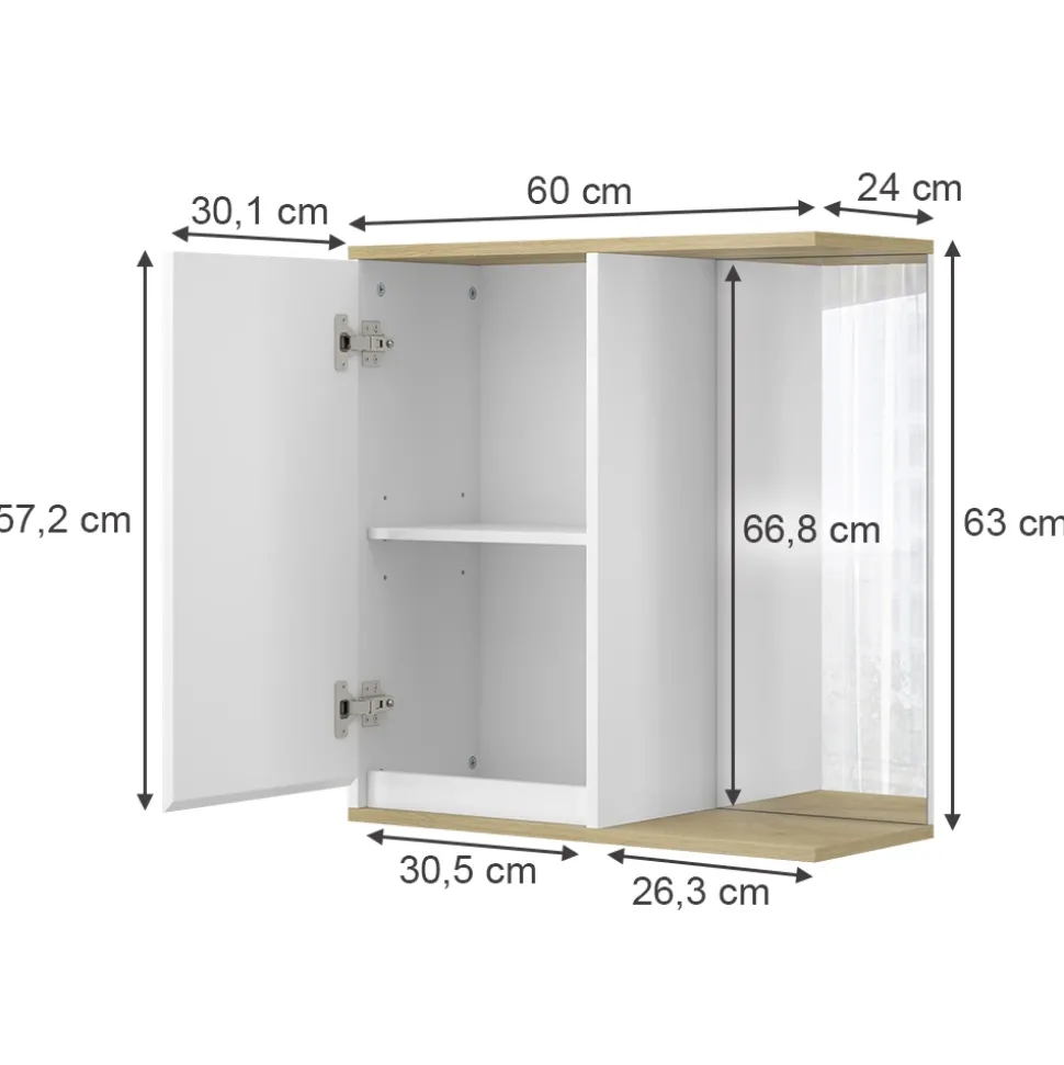 - MAßE: Der Badezimmerschrank mit Spiegel hat folgende Maße: Tiefe: 24 cm, Breite: 60 cm, Höhe: 63 cm.