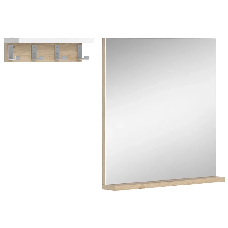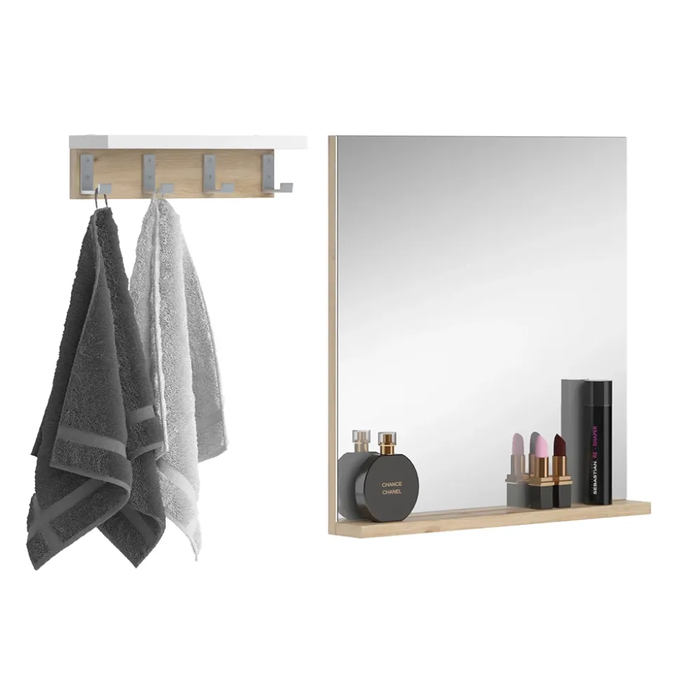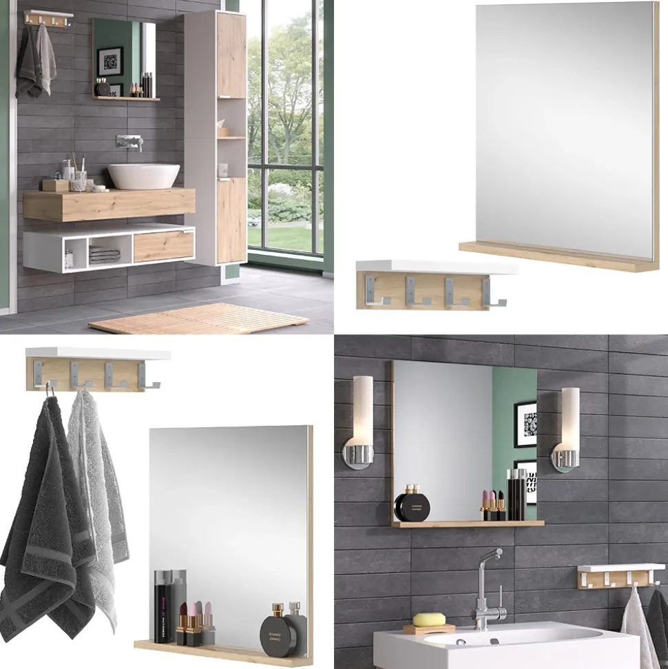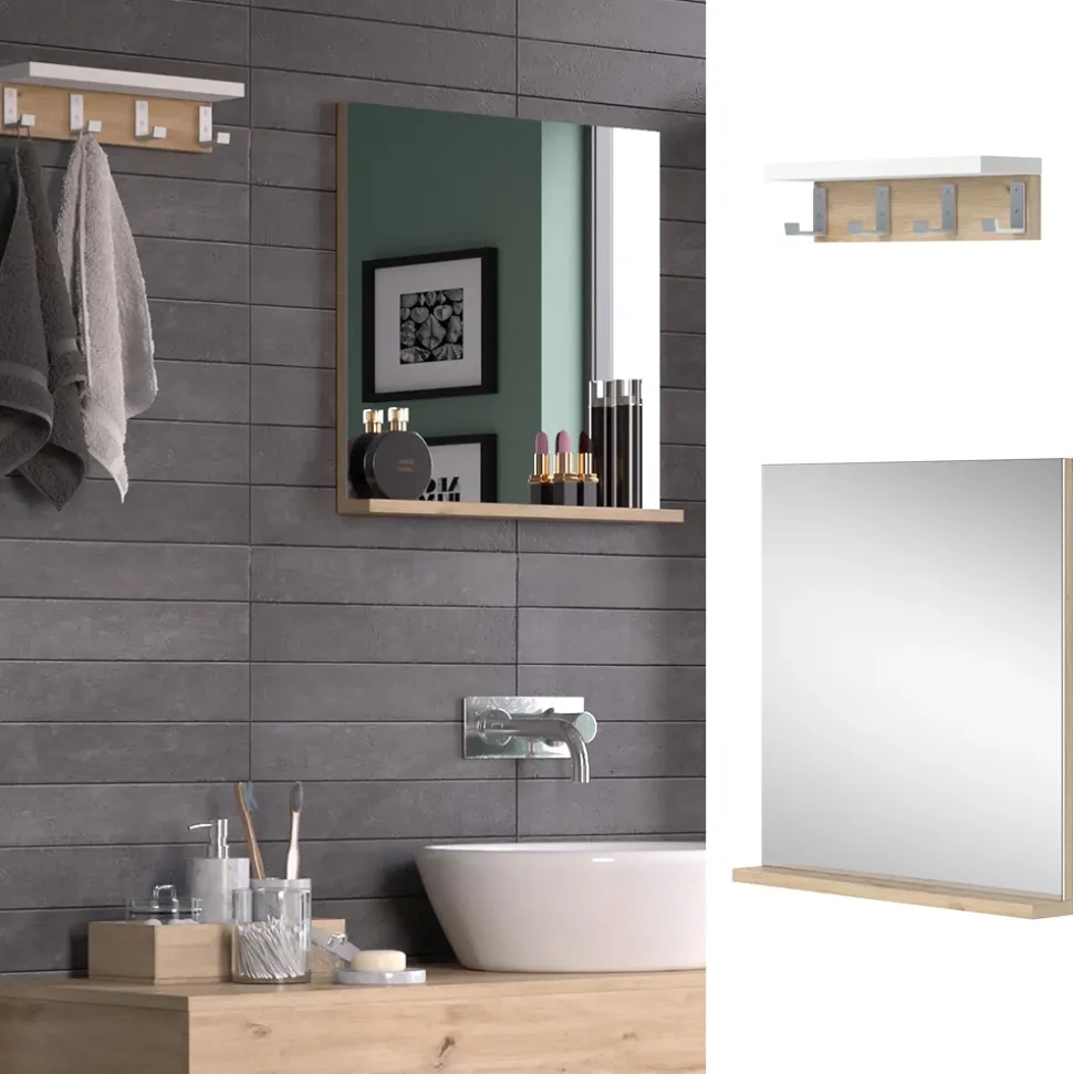 - Entdecken Sie das Vicco Badezimmerset Henri in Weiß-Artisan – bestehend aus einem Wandspiegel und einem Wandregal mit Haken für eine effektive Badezimmer-Organisation.