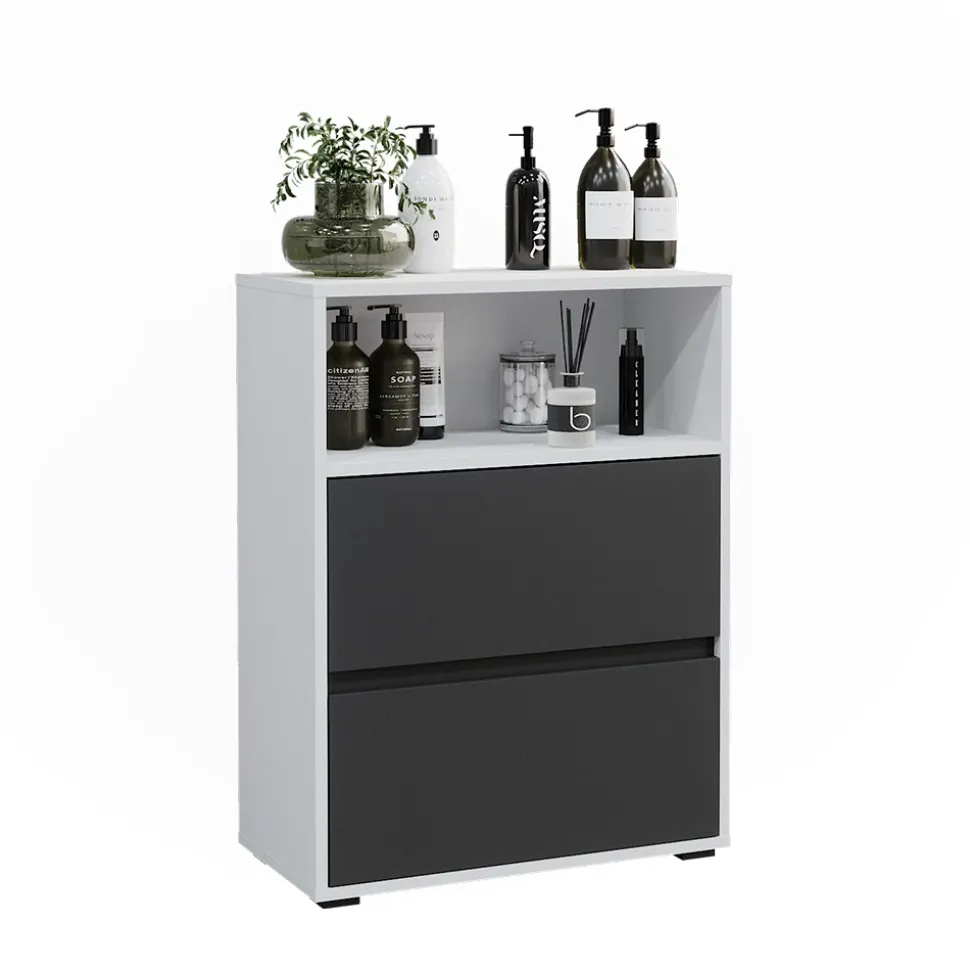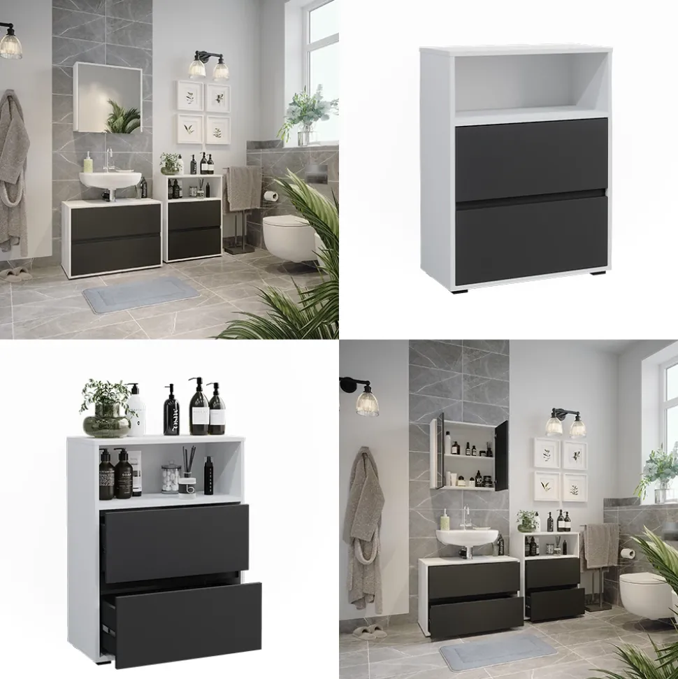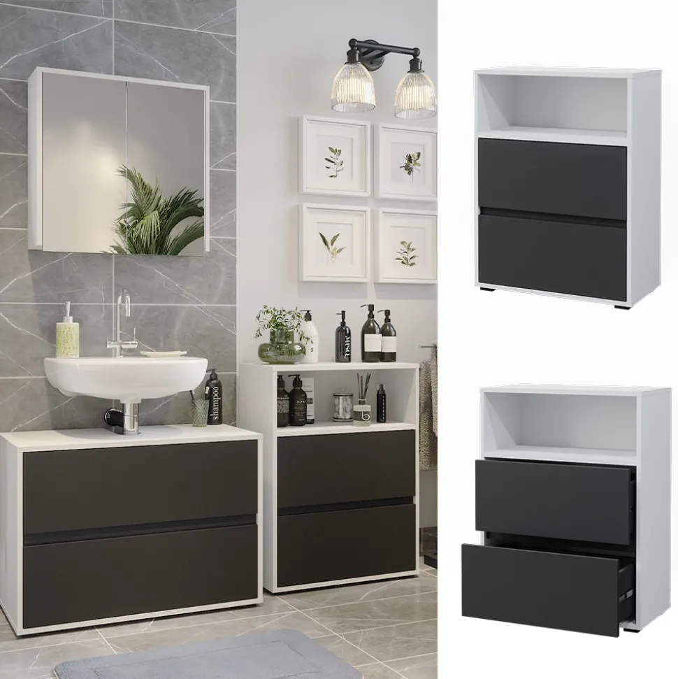 - Der Badezimmerschrank verfügt über zwei große Schubladen, ein offenes Fach und viel Stauraum.