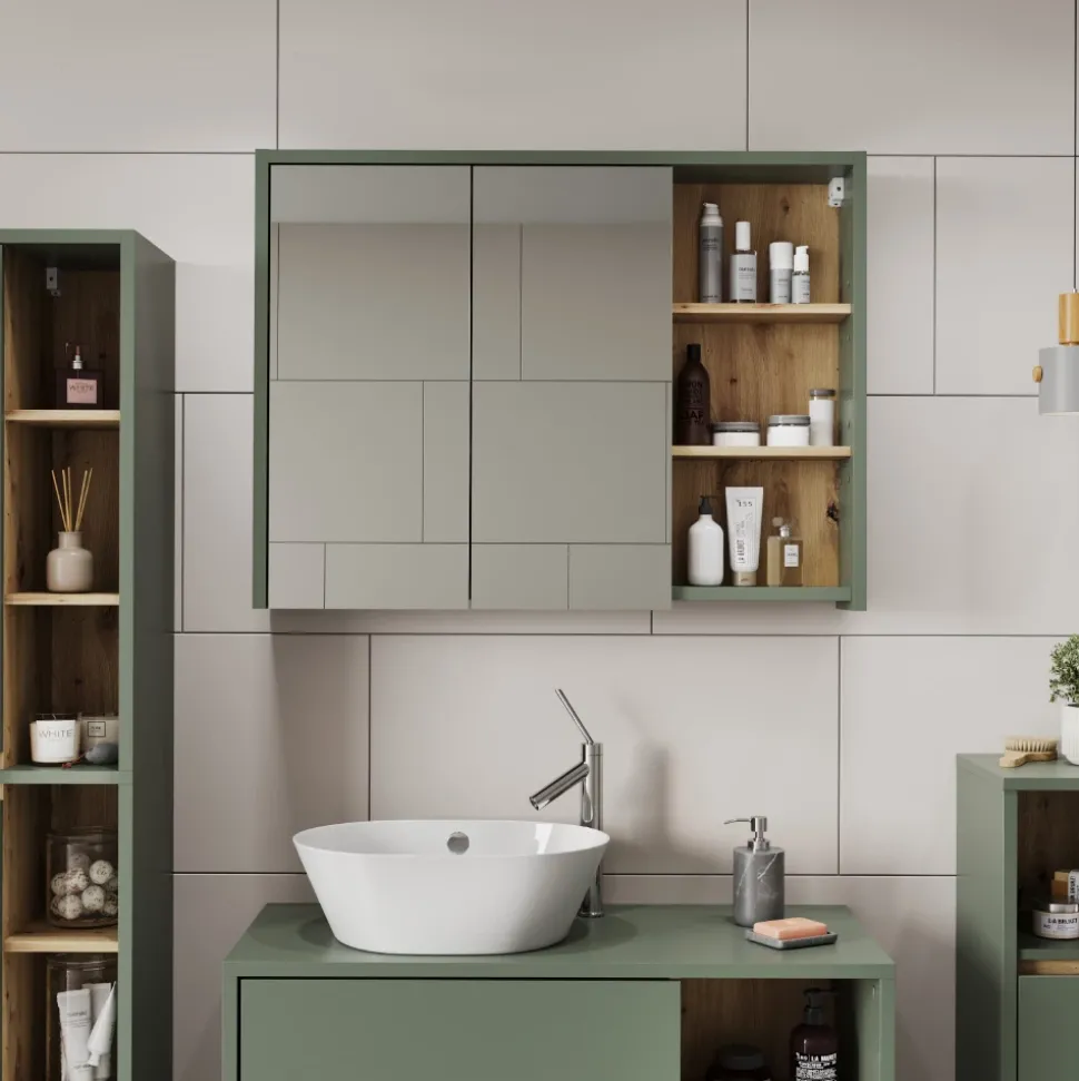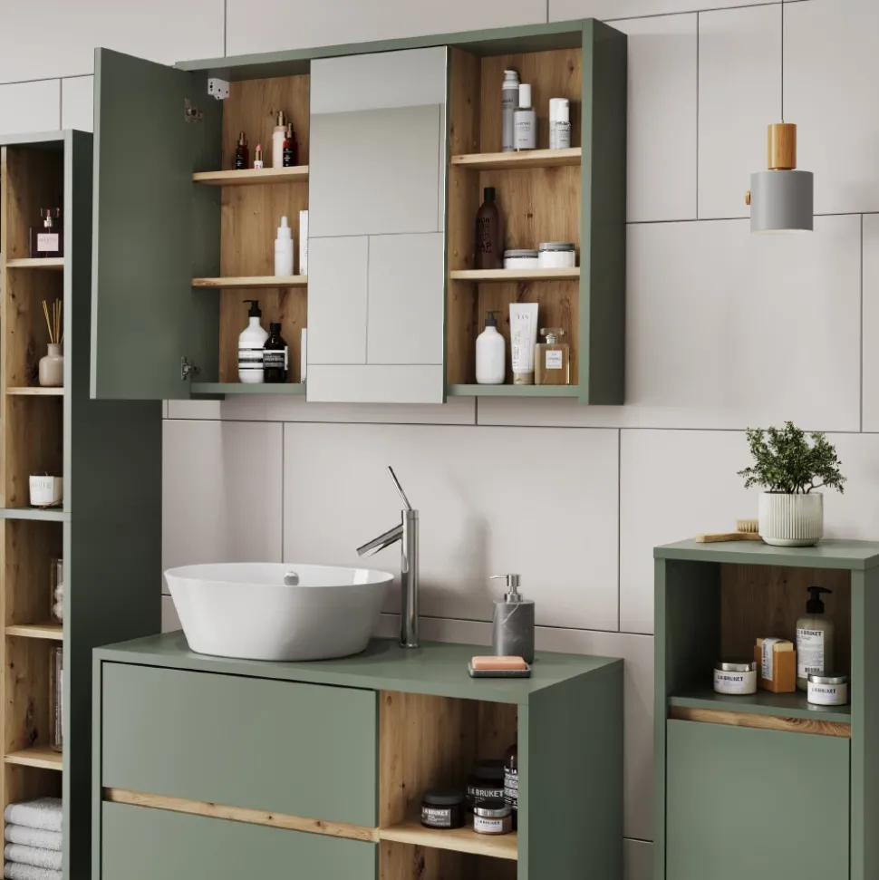 - Der Badezimmerschrank verfügt über zwei Spiegeltüren sowie offene und geschlossene Fächer. Er bietet reichlich Stauraum für alle Badutensilien.