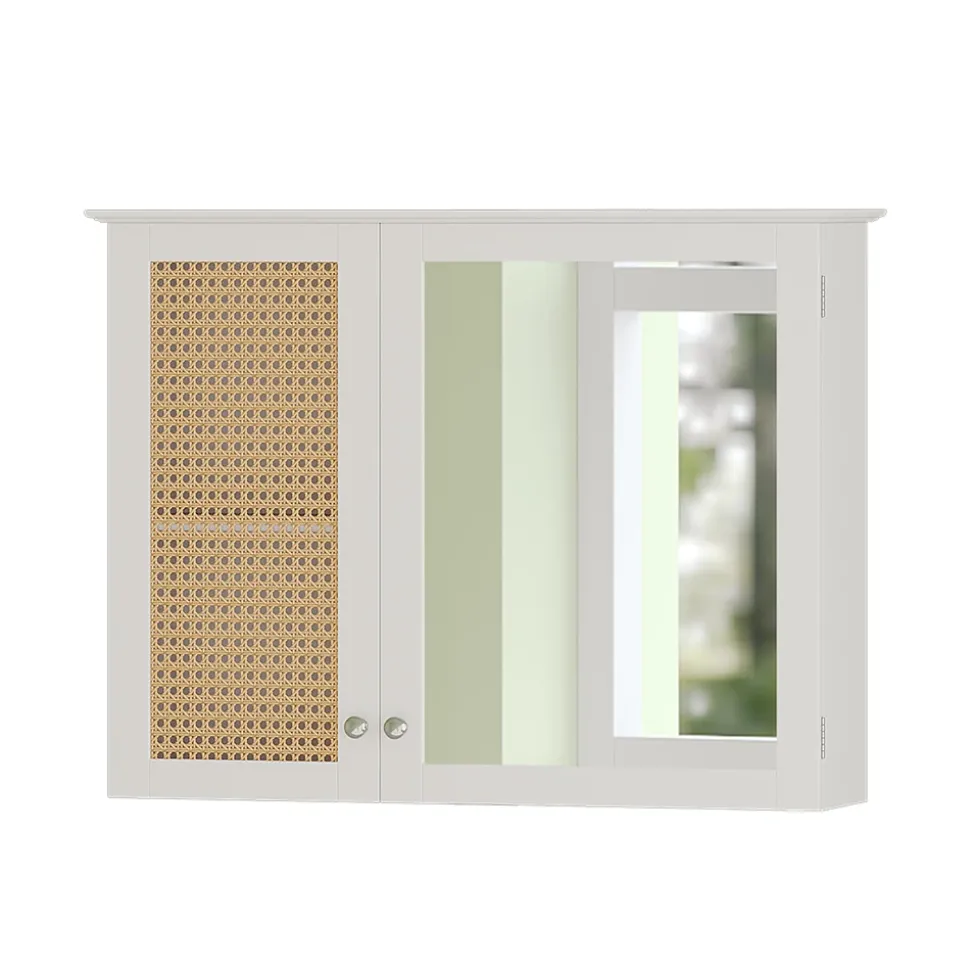 Lassen Sie sich von Rosario verzaubern – mit einzigartigem Rattangeflecht im Lochmuster an den Türen. Maximieren Sie Stauraum für eine organisierte Aufbewahrungslösung in Ihrem Badezimmer. Erleben Sie eine mühelose Montage, um Ihr Zuhause schnell zu verschönern. Die pflegeleichte Oberfläche erhält die Eleganz Ihres Spiegelschranks spielend und minimiert den Wartungsaufwand.