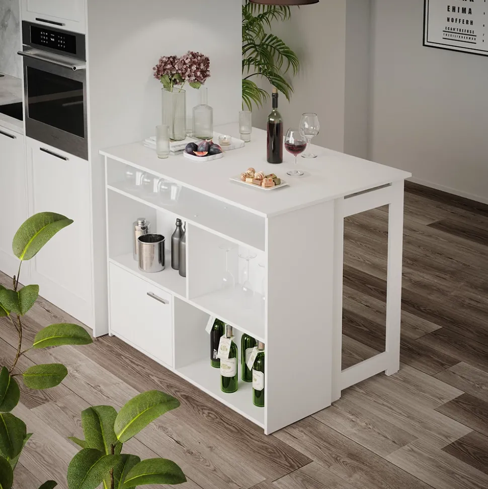 - Dieser Bartresen für das Esszimmer verfügt über 4 offene Fächer und 1 Tür, damit alles griffbereit ist. Die Tischplatte und das Beingestell sind gleichermaßen klappbar.