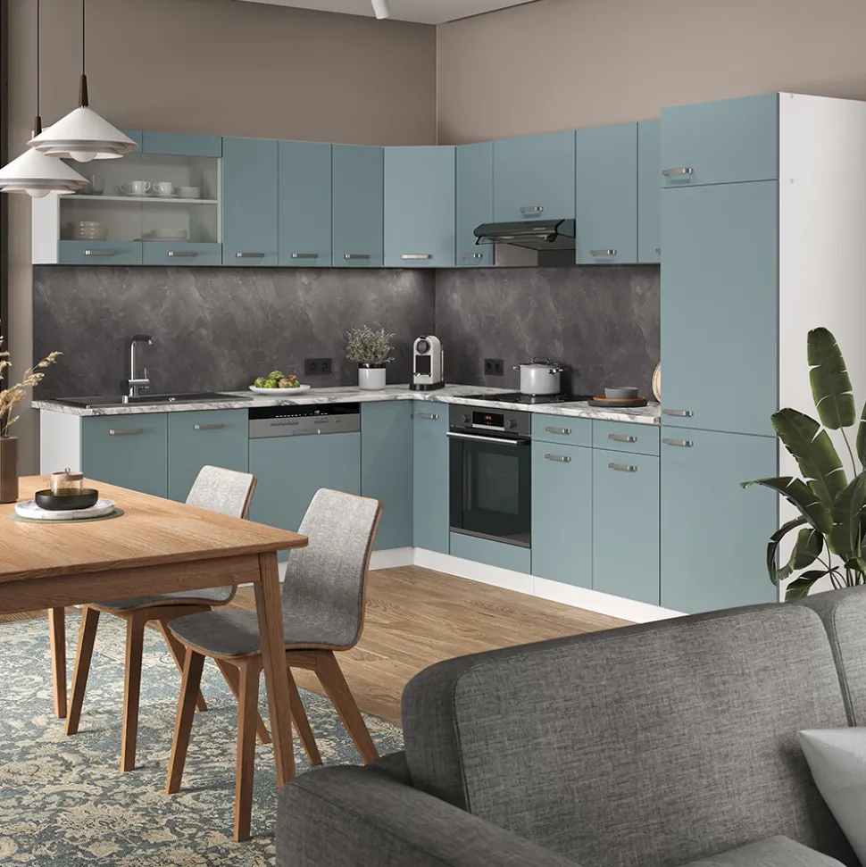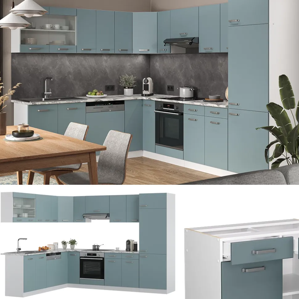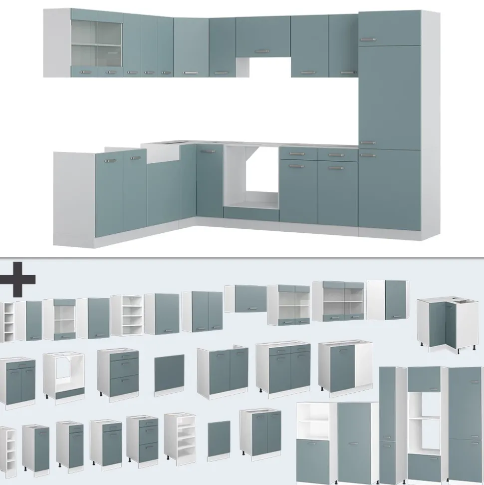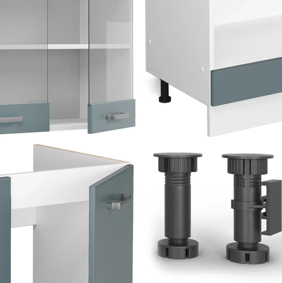 - Die Küchenzeile in L-Form lässt sich individuell umstellen und um zusätzliche Module erweitern. Dank höhenverstellbarer Füße ist eine bequeme Nutzung möglich.