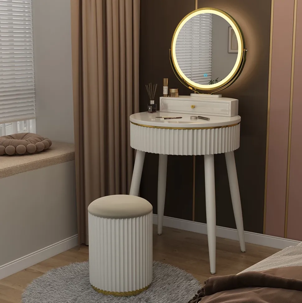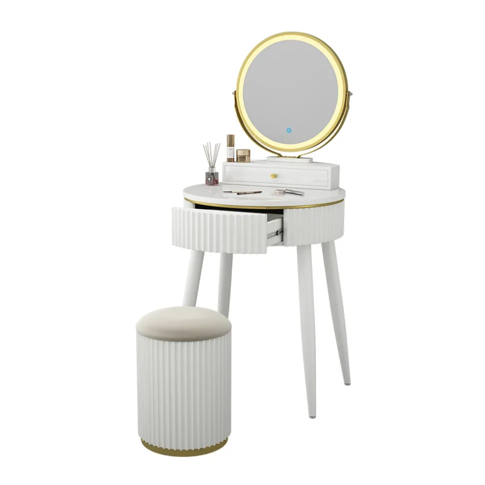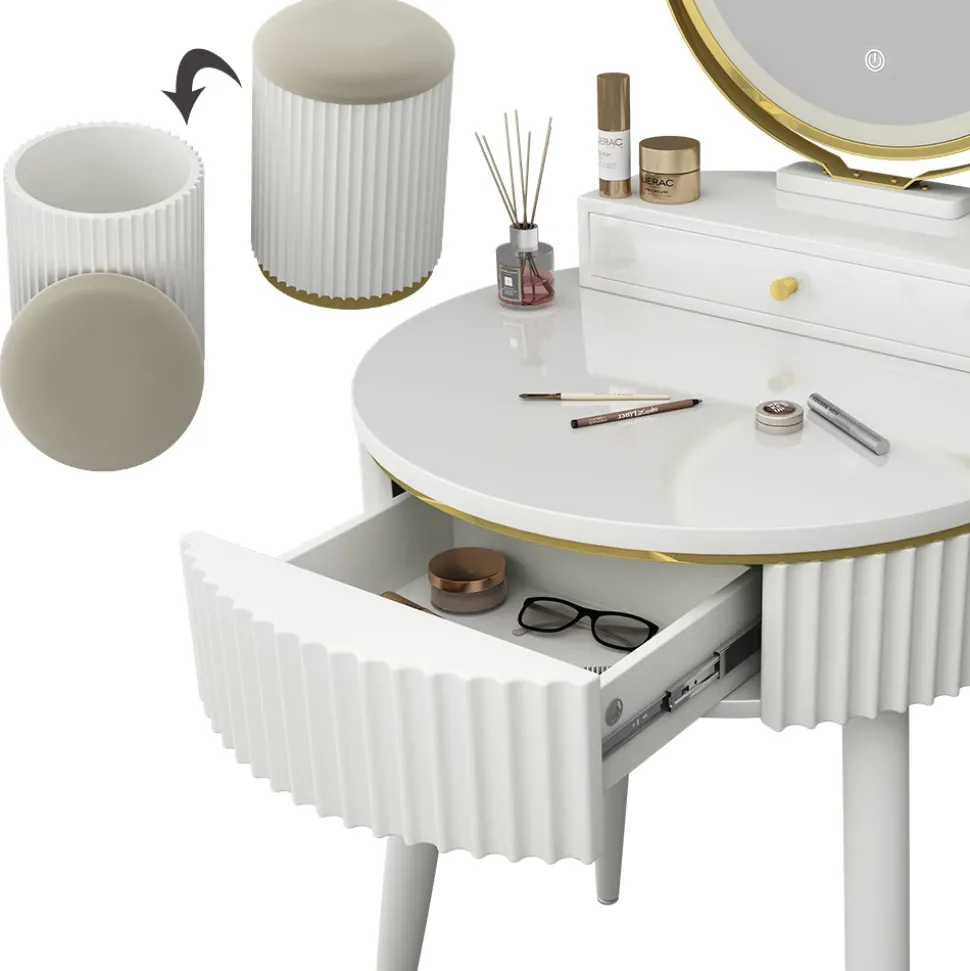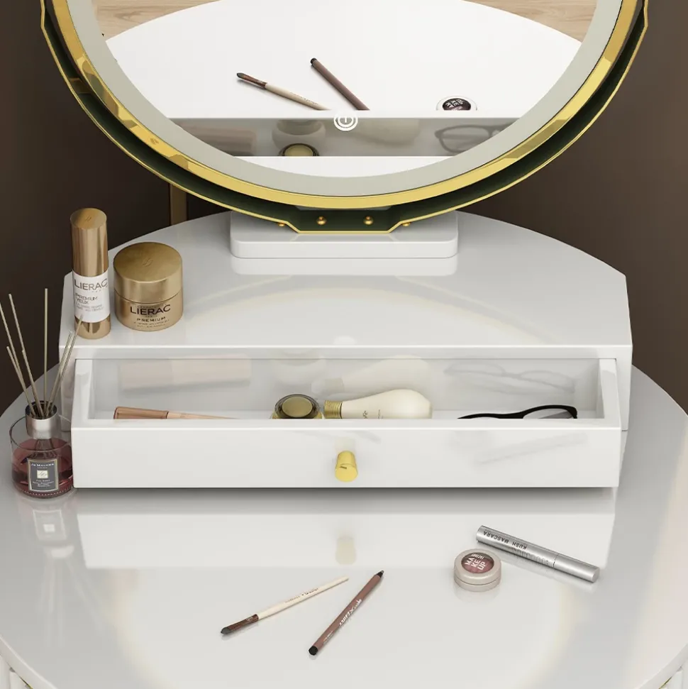- Der LED-Spiegel des Schminktisches verfügt über drei verschiedene, einstellbarere Helligkeits-Stufen. Außerdem verfügt er über zwei Schubladen.