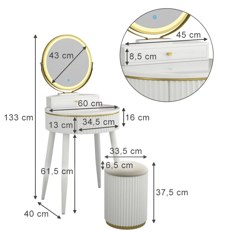 - MAßE: Der Schminktisch ist 60 cm breit, 133 cm hoch und 40 cm tief. Alle detaillierten Maße sind auf den Fotos angegeben.