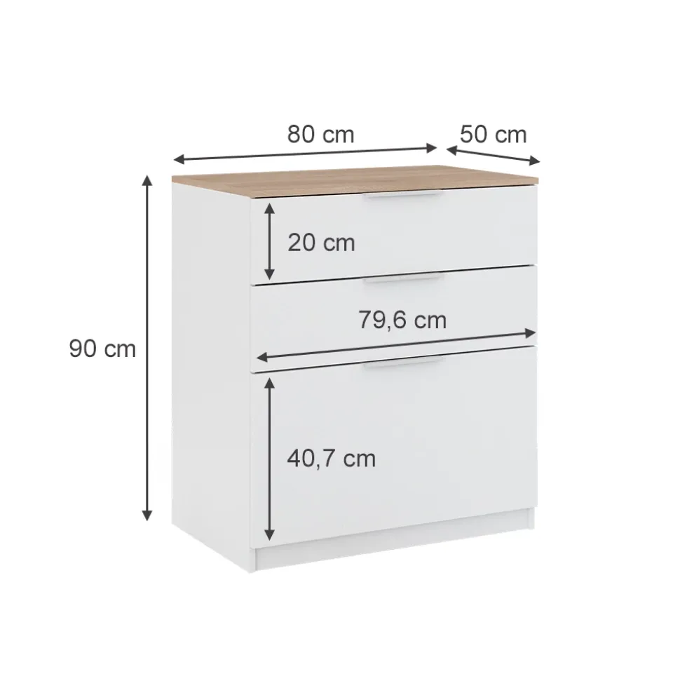 - MAßE: Die Kommode mit 3 Schubladen hat eine Tiefe von 50 cm, eine Breite von 80 cm und eine Höhe von 90 cm. Alle detaillierten Größen sind auf den Fotos angegeben.