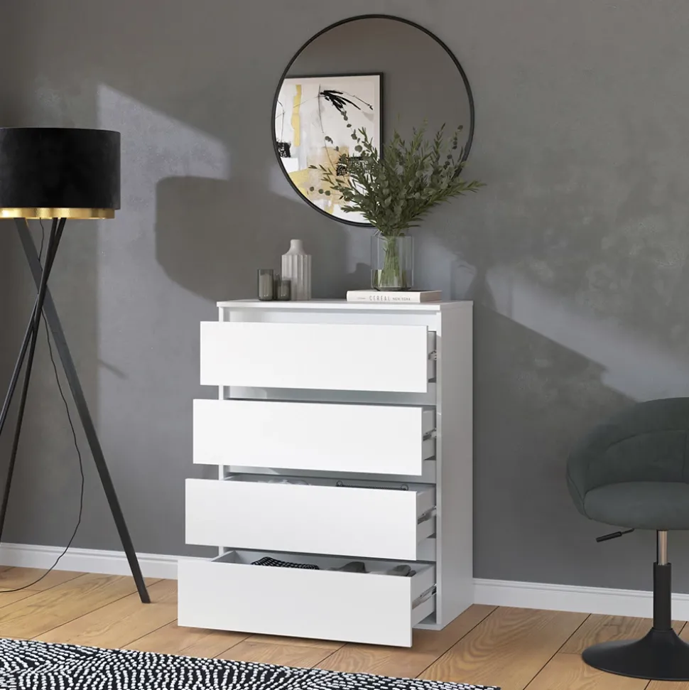 Die Kommode „Claus“ ist nicht nur ein praktischer Schubladenschrank für Ihr Schlafzimmer, sondern auch ein echter Blickfang dank ihres modernen Designs und der hochwertigen Verarbeitung. Ob als Sideboard oder Anrichte – ihre vielseitigen Einsatzmöglichkeiten machen sie zu einem unverzichtbaren Möbelstück in jedem Zuhause. Mit vier geräumigen Schubladen bietet die Kommode ausreichend Stauraum für Kleidung, Accessoires oder andere Gegenstände. Überzeugen Sie sich von Funktionalität und Stil der Kommode „Claus“ und verleihen Sie Ihrem Schlafzimmer eine besondere Note.