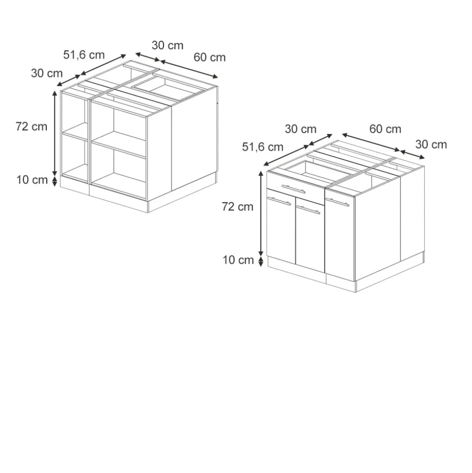 - MATERIAL: Die freistehenden Küchenmöbel besteht aus pflegeleichter Spanplatte 16 mm, mit einer Melaminharzbeschichtung. Alle Fronten der Kücheneinheiten sind aus hochwertigem MDF hergestellt