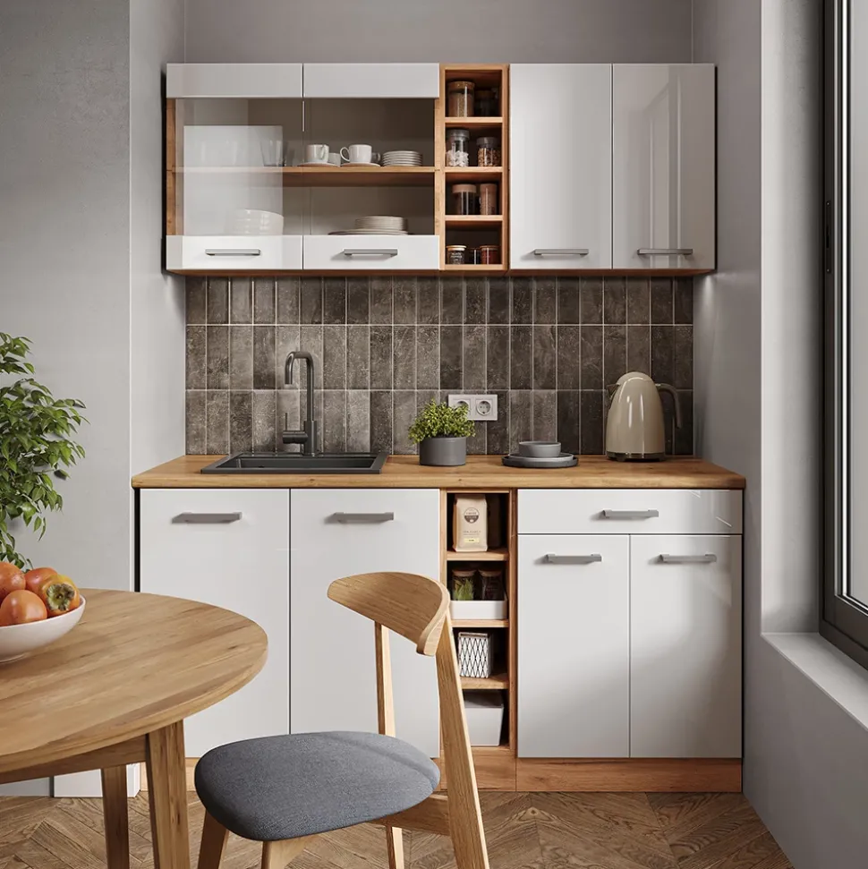 - Der Küchenschrank ist offen und kann beliebig umgestellt werden. Zusätzliche Module können hinzugefügt werden.