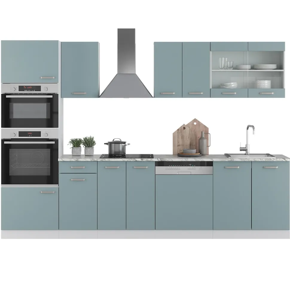 - MAßE: Die Küchenzeile mit Hochschrank hat eine Breite von 300 cm, eine Höhe von 206,8 cm und eine Tiefe von 57,2 cm. Alle detaillierten Größen sind auf den Fotos angegeben