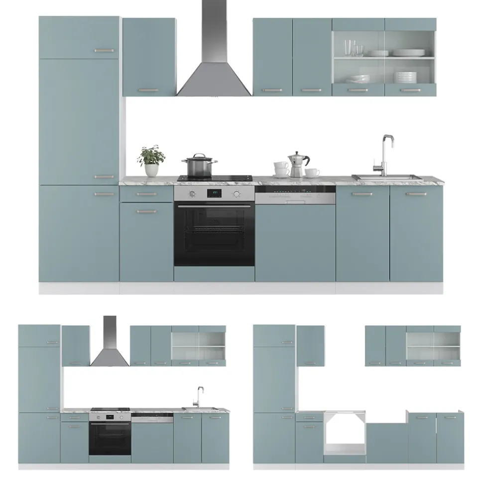 - MAßE: Die Küchenzeile hat eine Breite von 300 cm, eine Höhe von 206,8 cm und eine Tiefe von 57,2 cm. Alle detaillierten Größen sind auf den Fotos angegeben