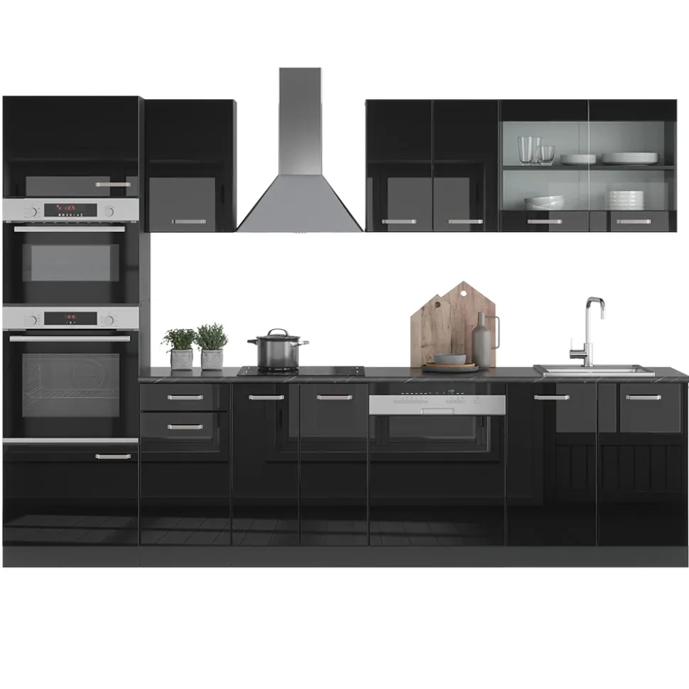 - MAßE: Die Küchenzeile mit Hochschrank hat eine Breite von 300 cm, eine Höhe von 206,8 cm und eine Tiefe von 57,2 cm. Alle detaillierten Größen sind auf den Fotos angegeben