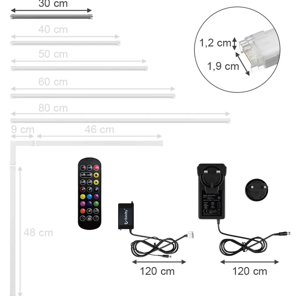 - LIEFERUMFANG: LED-Leiste, Netzgerät mit Kabel, Steckdosenadapter und Fernbedienung, Montageanleitung, Montagematerial.