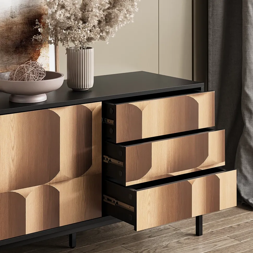 Das Lowboard Eliza ist nicht nur ein praktisches Möbelstück für Ihren Wohnbereich, sondern auch ein echter Hingucker. Mit seinen drei Schubkästen und zwei Einlegeböden bietet es ausreichend Stauraum für Ihre elektronischen Geräte und Zubehör. Der 3D-Look verleiht dem TV Schrank eine moderne Note, während das Push-to-open-System für ein einfaches Öffnen und Schließen sorgt. Stellen Sie sich vor, wie Sie gemütlich auf der Couch sitzen, Ihre Lieblingsserie läuft im Fernsehen und alles, was Sie brauchen, ist griffbereit im Lowboard Eliza verstaut. Gönnen Sie sich diesen Komfort und verschönern Sie Ihr Zuhause mit diesem stilvollen Möbelstück.